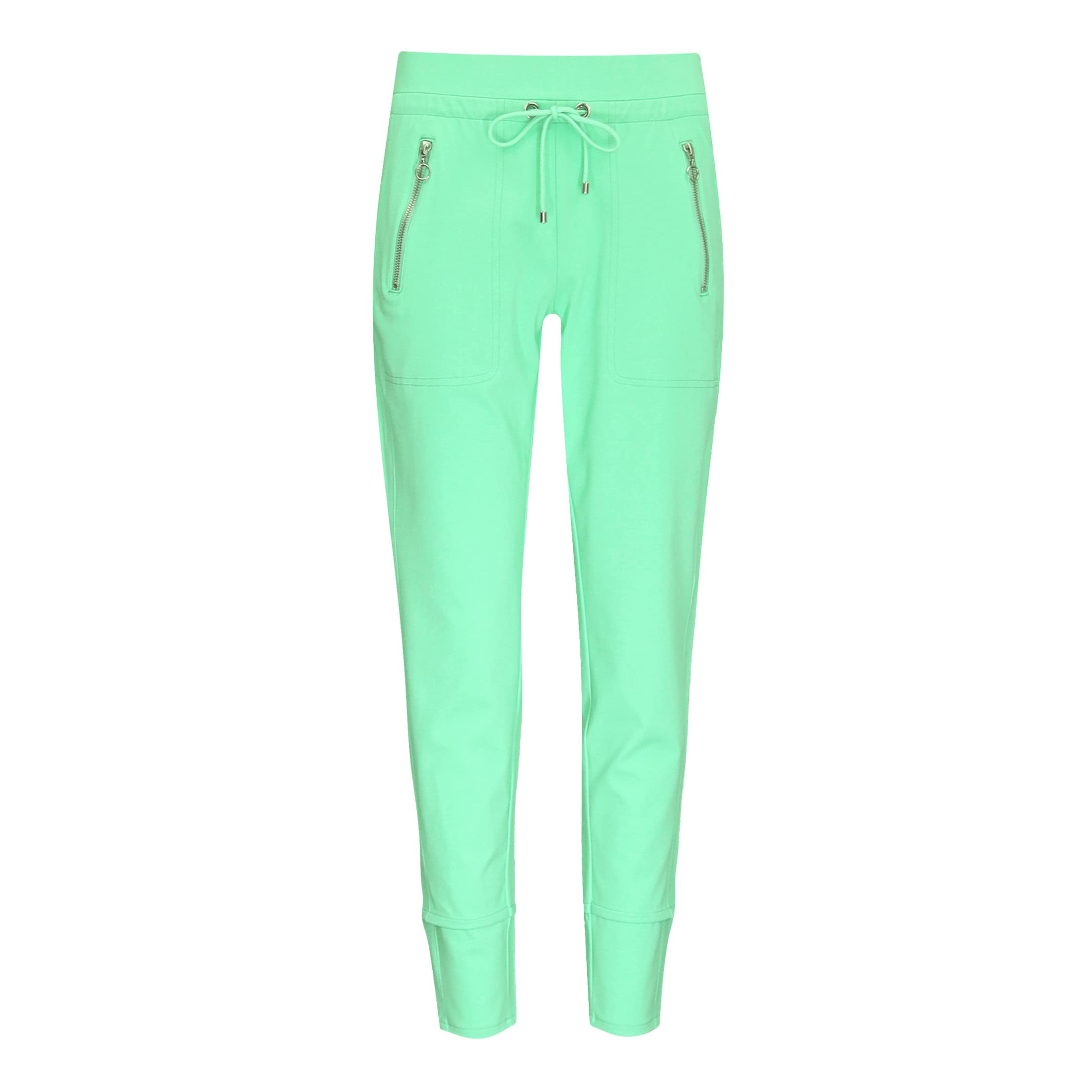 Groene relaxte pantalon van MAC, model Easy active. Deze broek heeft twee zakken achter een ritssluiting. De broek is gemaakt van een soepel vallende stretch stof met een fijne ribbel en heeft een elastische taille met trekkoord.