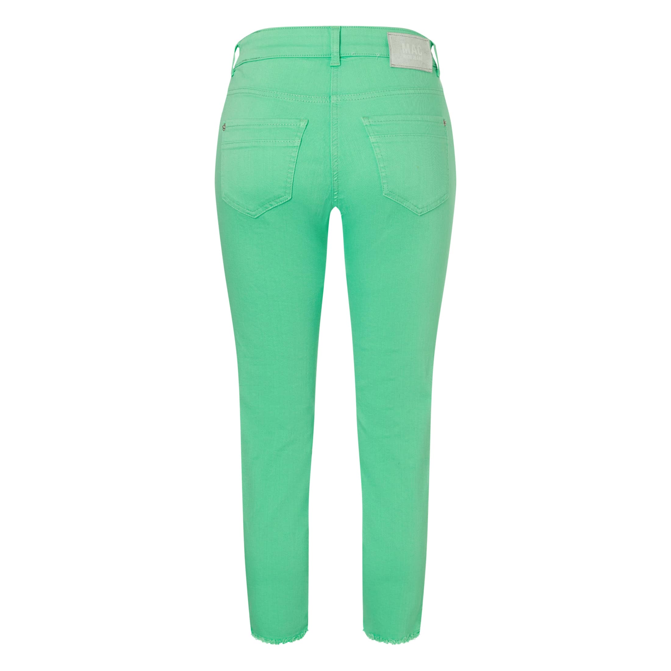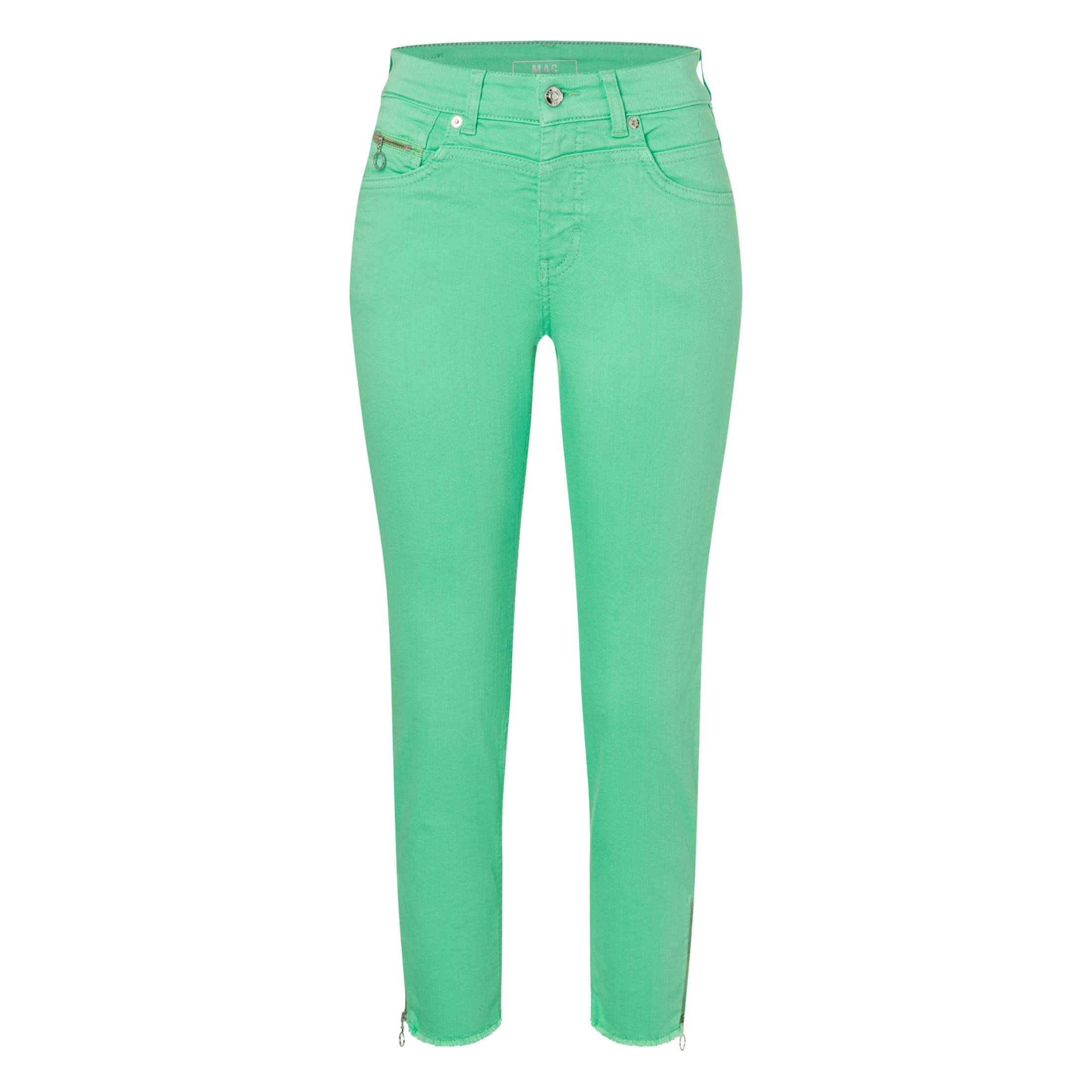 Groene jeans van MAC, model Rich Slim Chic, straight fit, slim leg. Deze 7/8 denim broek heeft een slim fit pasvorm met twee steekzakken aan de voorzijde en twee achterzakken. De spijkerbroek is gemaakt van een denim stretch stof en sluit met een knoop- en ritssluiting. De onderzijde van de broekspijpen zijn fijn gerafeld en hebben een ritsje aan de zijkant.