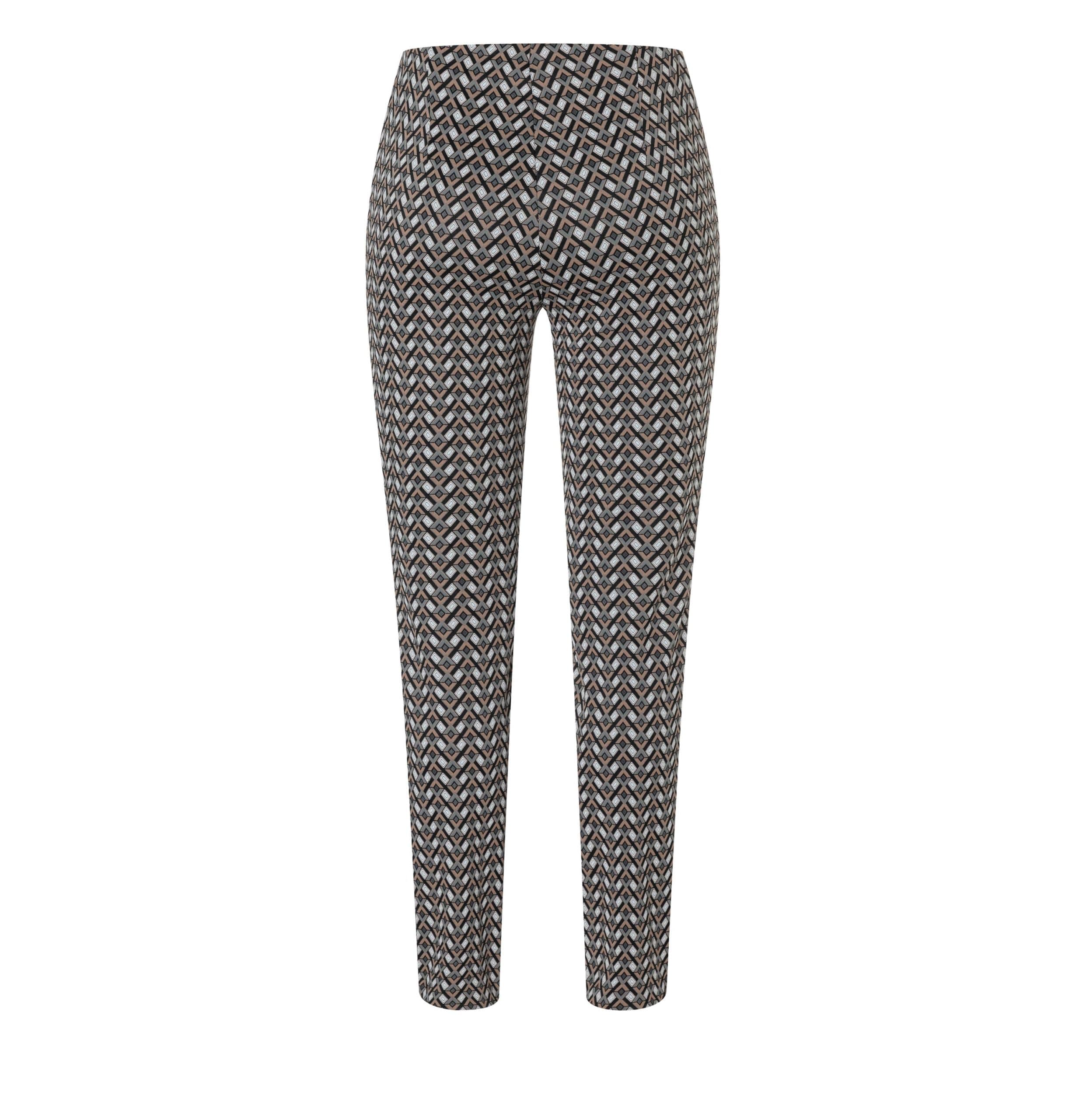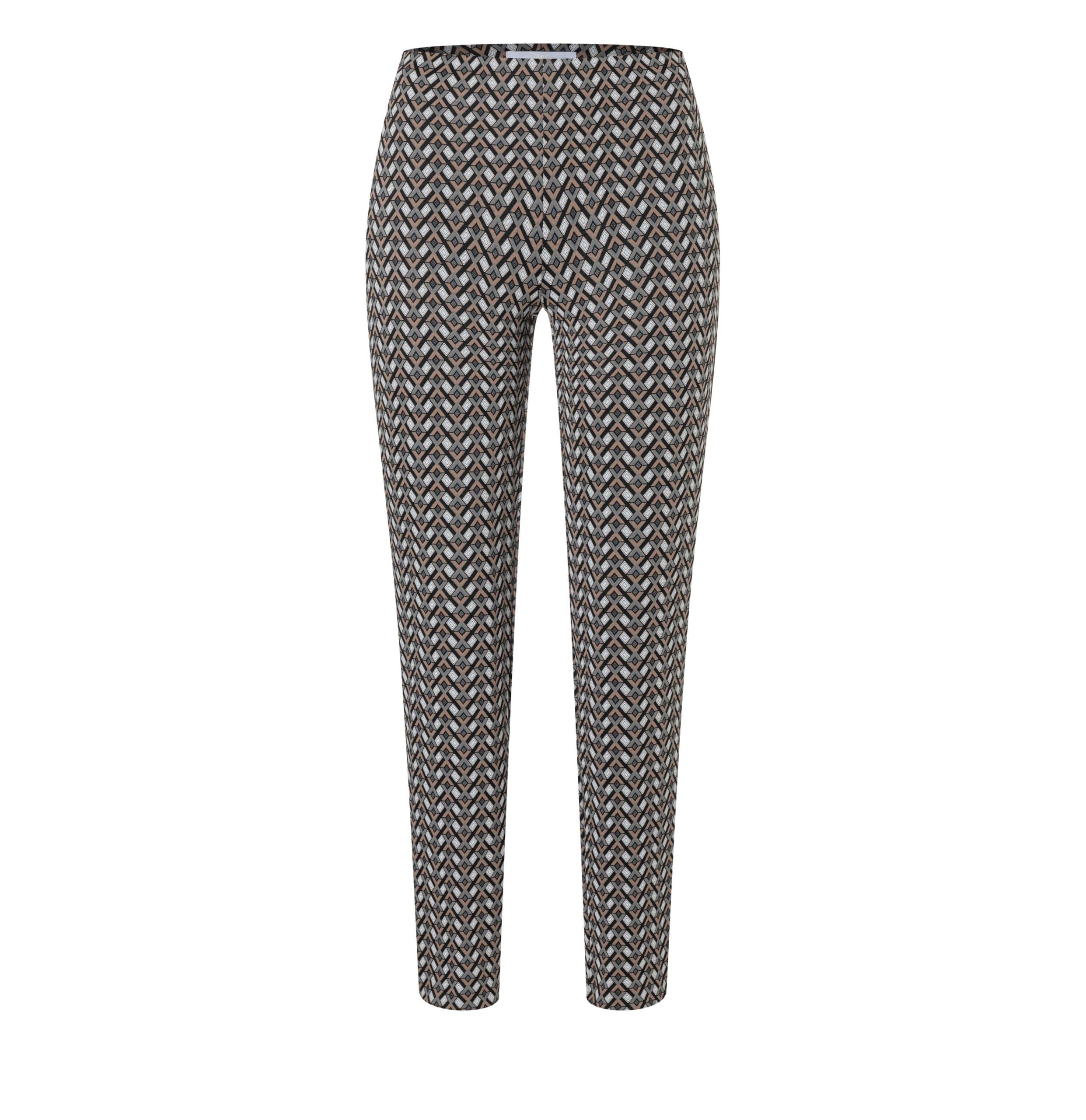 Pantalon met jacquard motief van MAC, model Anna jump in in hot chocolate jacquard. Deze slim fit broek is gemaakt van stretch stof, heeft toelopende pijpen en valt net boven de enkels. De pantalon heeft een midden hoge taille en een elastische tailleband.