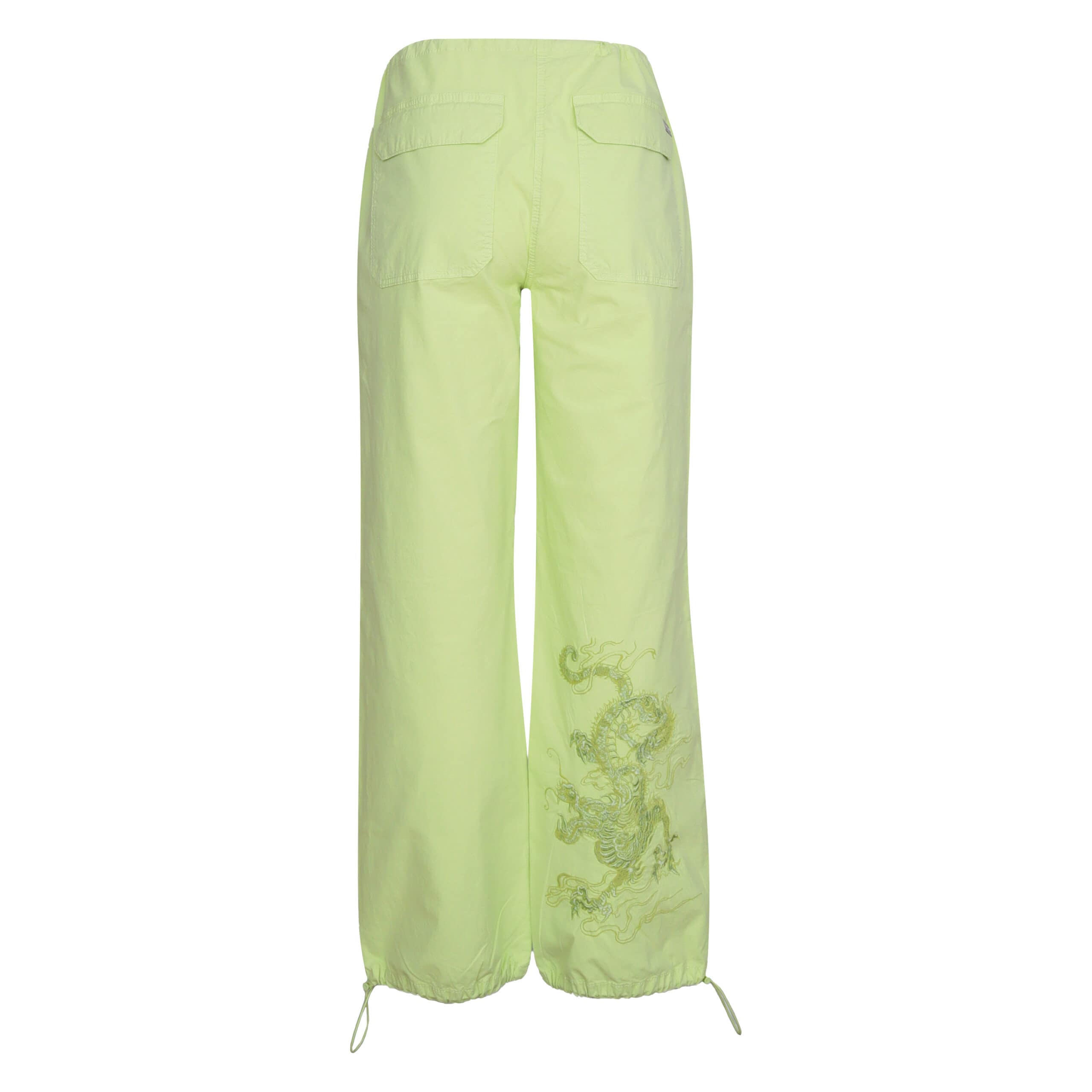 Relaxte pantalon van MAC, model Jet dragon in neon groen. Deze broek is gemaakt van een neon groene katoenen stretch stof en heeft op een onderbeen aan de achterzijde een geborduurde draak. De broek heeft een elastische taille met een trekkoord die aan de binnenzijde aangetrokken wordt, normale taille, twee steekzakken en twee achterzakken met een klep.