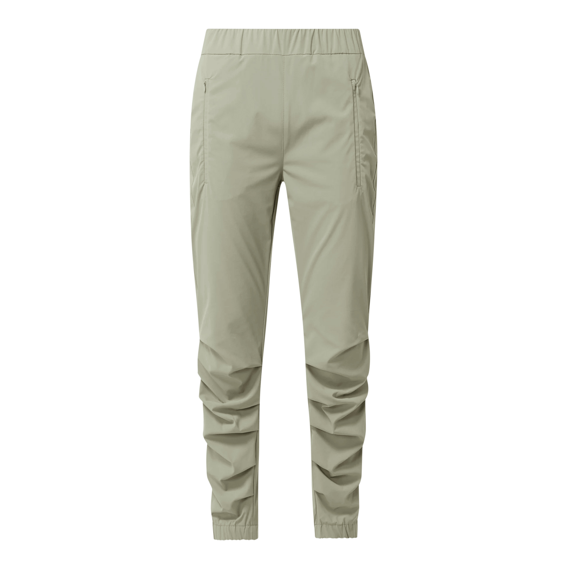 Kaki groene pantalon van MAC, model Daydream Motion flow. Deze broek is gemaakt van een dunne effen kaki groene stretch stof en is aan de onderzijde van de broekpijpen geplooid. De pantalon heeft een elastische tailleband, twee zakken achter ritsjes en achterzakken.