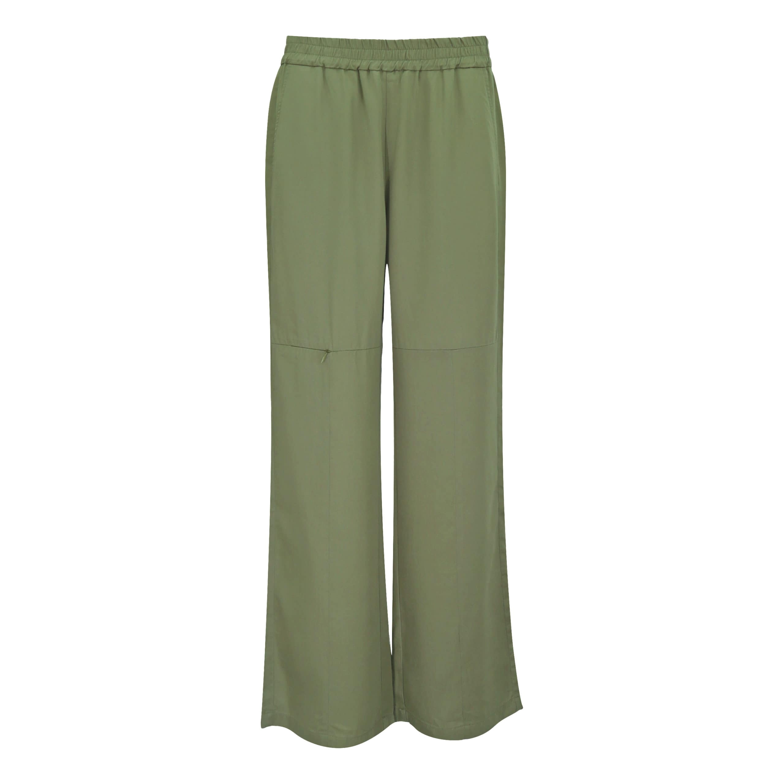 Wijde pantalon van MAC, model Esther. Deze relaxte pantalon is gemaakt van lyocell en heeft een effen kaki kleur. De losvallende broek heeft een hoge elastische taille, wijde broekspijpen, twee steekzakken, twee achterzakken en een klein ritsje op het bovenbeen met daarachter een zak.