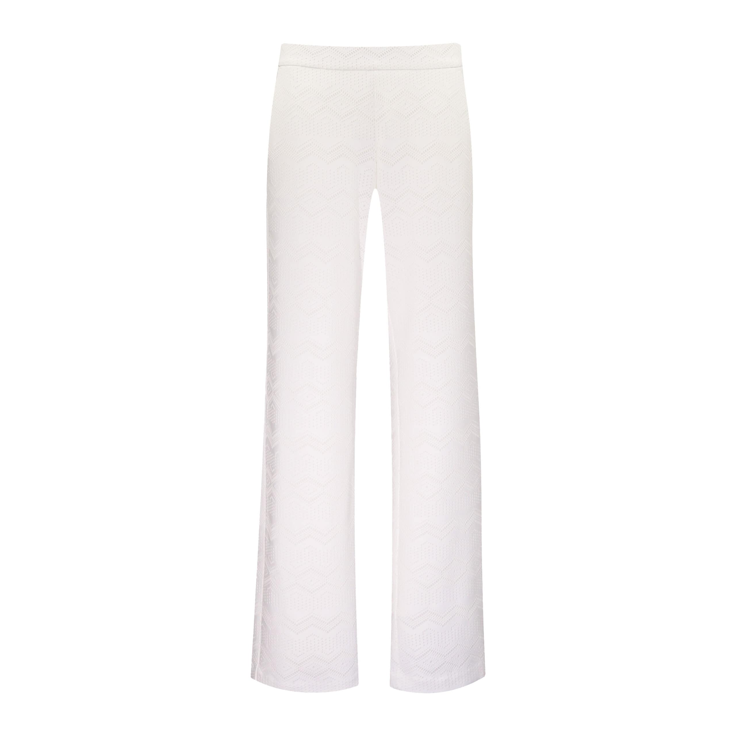 Off white pantalon van MAC, model Chiara. Deze pantalon is gemaakt van een kanten stretch stof die aan de binnenzijde gevoerd is en heeft wijde, rechte broekspijpen. De losvallende broek heeft een elastische taille en twee steekzakken.