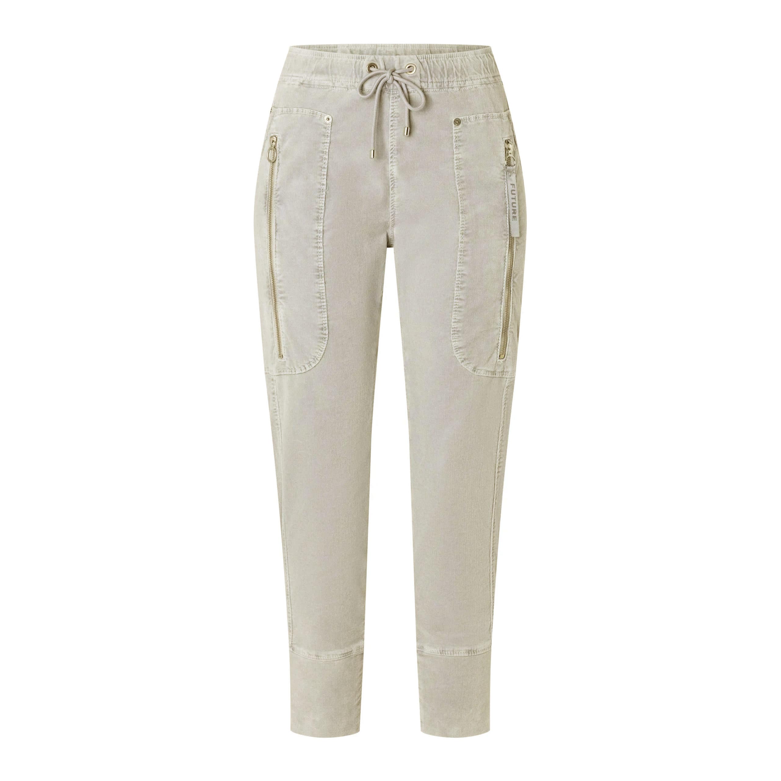 Relaxte pantalon van MAC Jeans, model Future 2.08 casual. Deze licht beige broek heeft taps toelopende broekspijpen met twee zakken achter ritsjes aan de voorzijde. De broek is gemaakt van een soepel vallende fijne ribfluwelen stof en heeft een tailleband met trekkoord.