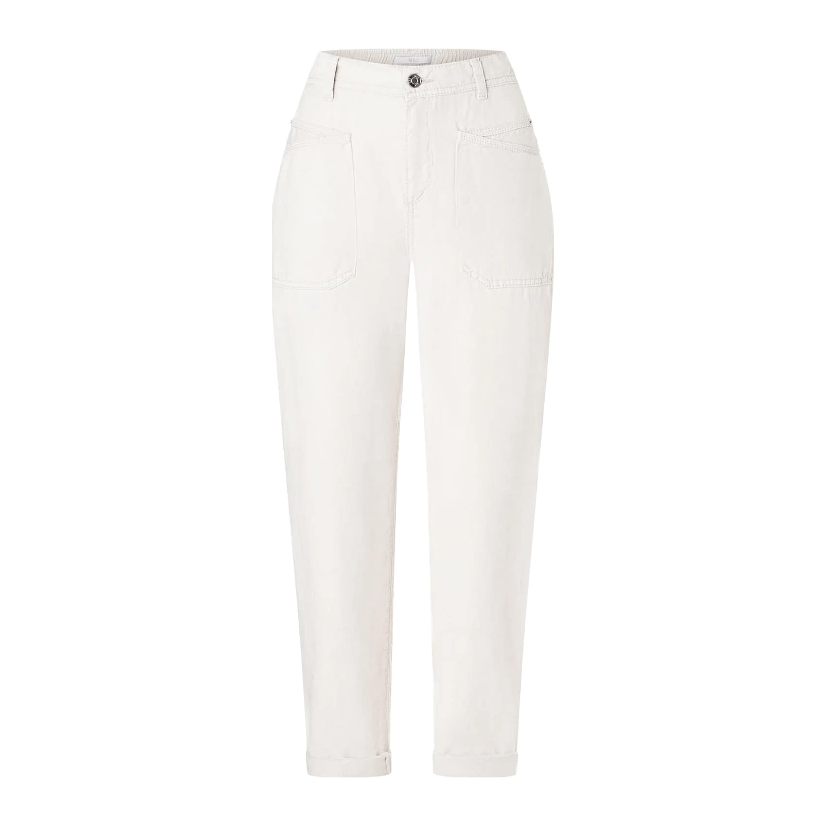 Licht grijze relaxte pantalon van MAC, model Ivy in aluminium white. Deze 7/8 pantalon is gemaakt van een lichte stof mix van katoen, lyocell en linnen en heeft toelopende broekspijpen. De pantalon heeft een elastische taille, sluit met een knoop- en ritssluiting en heeft aan de achterzijde twee sier paspelzakjes.