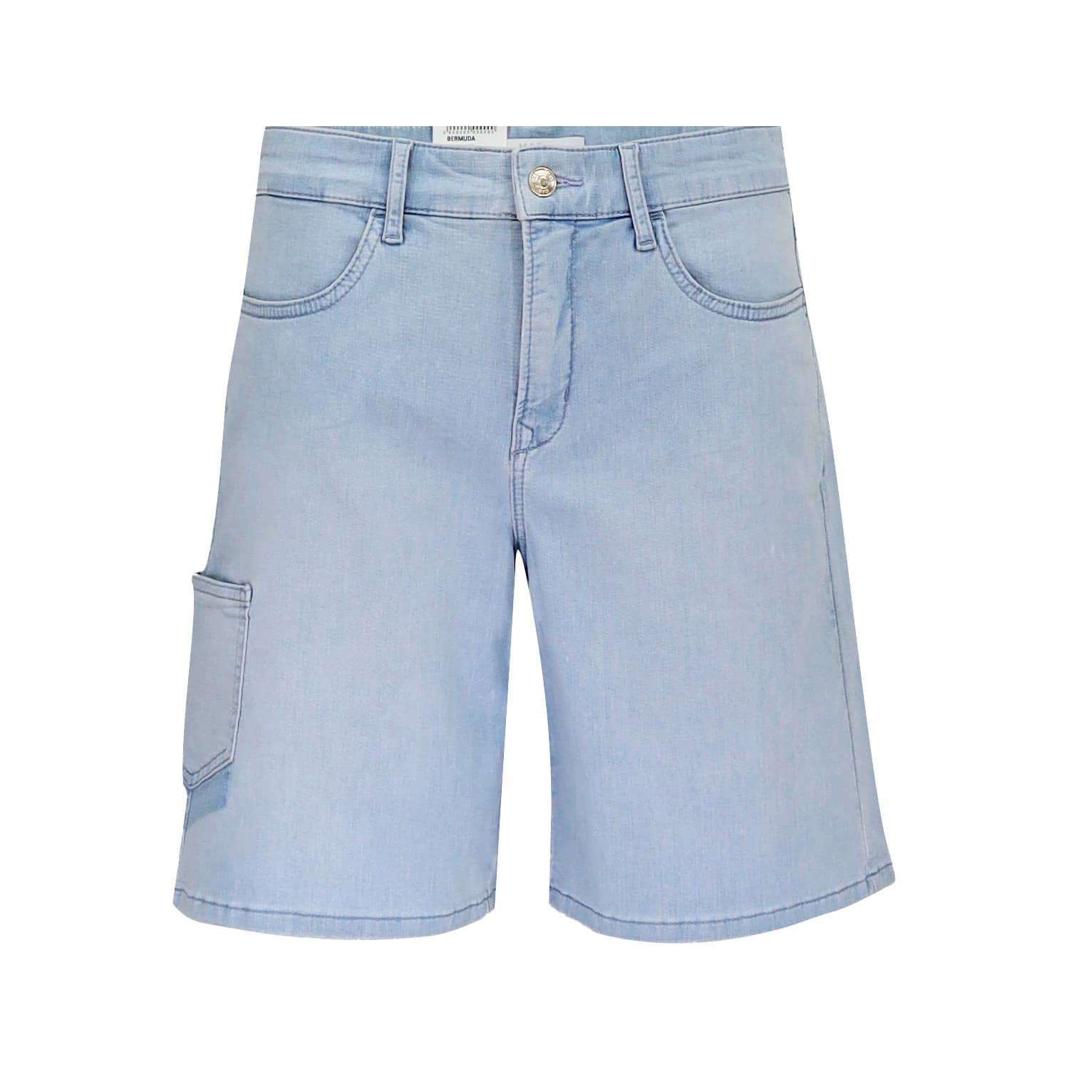 Lichtblauwe bermuda van MAC, model Bermuda cargo patch, wide leg. Deze korte broek is gemaakt van een stretch denim en heeft korte wijde broekspijpen. De shorts sluit met een knoop- en ritssluiting, heeft twee steekzakken, twee achterzakken en een cargo zak op het bovenbeen. De cargo zak en achterzakken hebben een iets donkerdere strook onder de zak, zodat het lijkt dat ze verzet zijn.