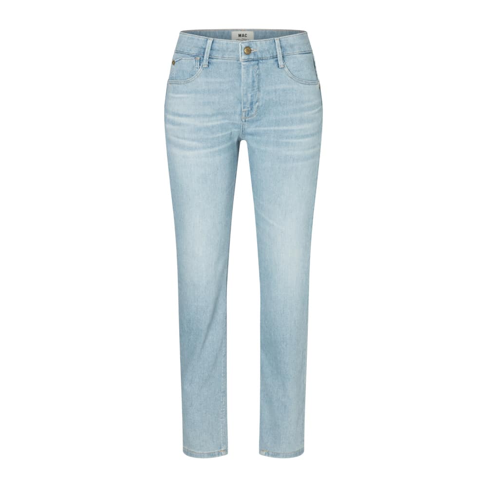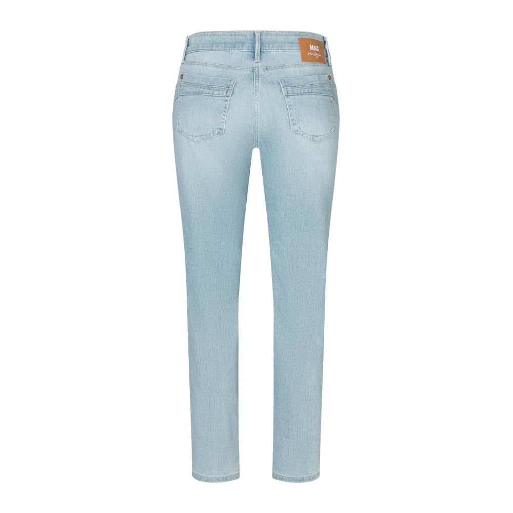 Lichtblauwe jeans van MAC, model California Slim, slim fit, low rise, 5-pocket. Deze broek is gemaakt van stretch denim, heeft een normale taille en een slim fit pasvorm. De jeans sluit met een knoop- en ritssluiting, heeft twee steekzakken en twee achterzakken.