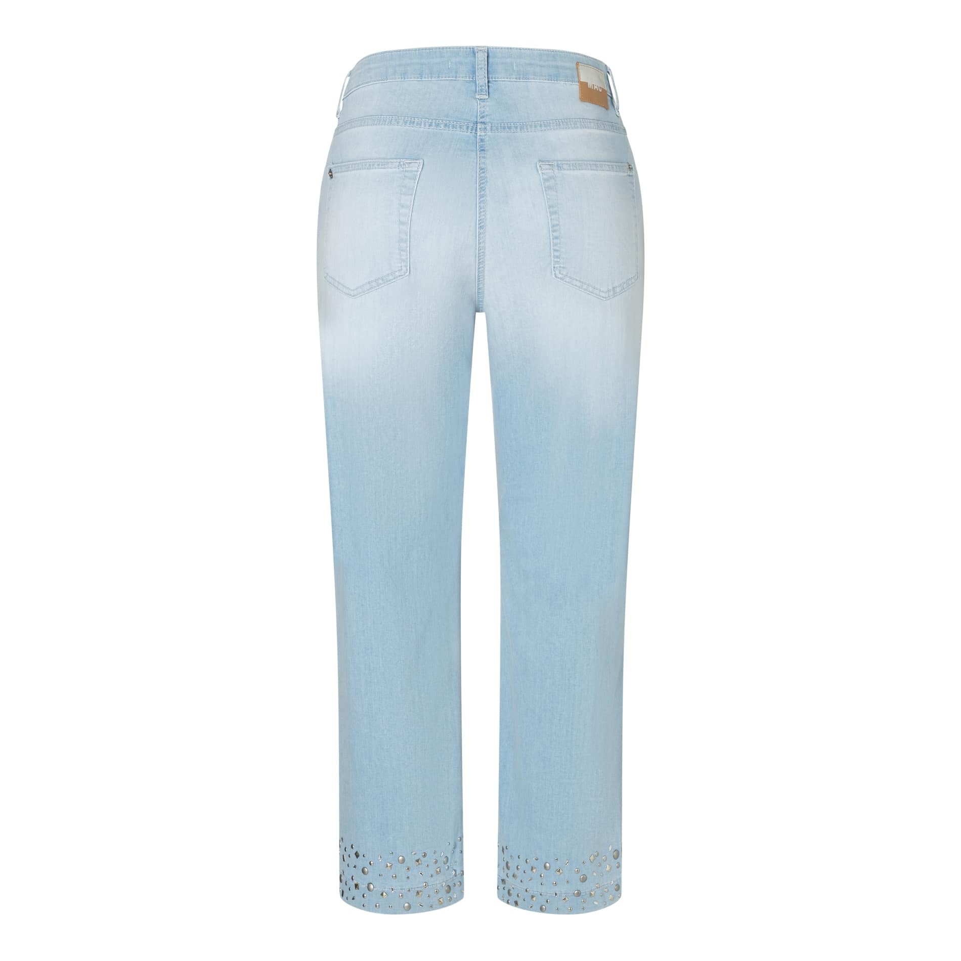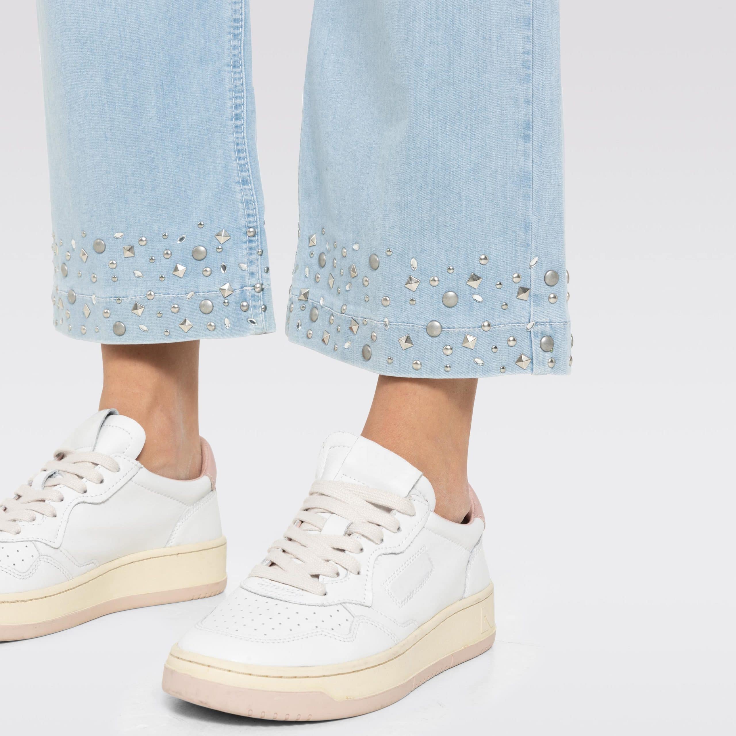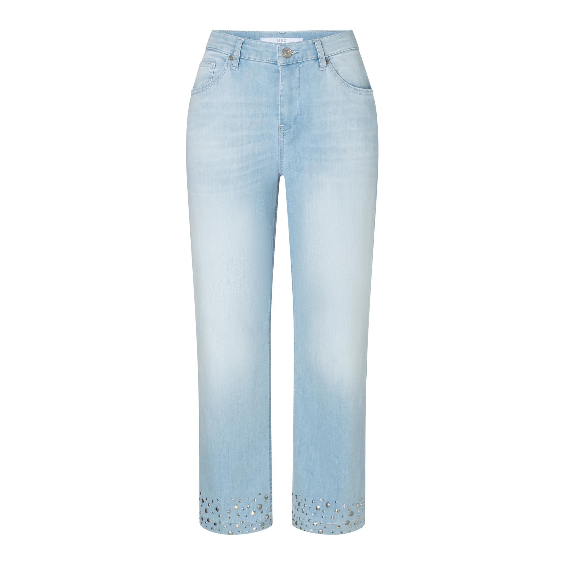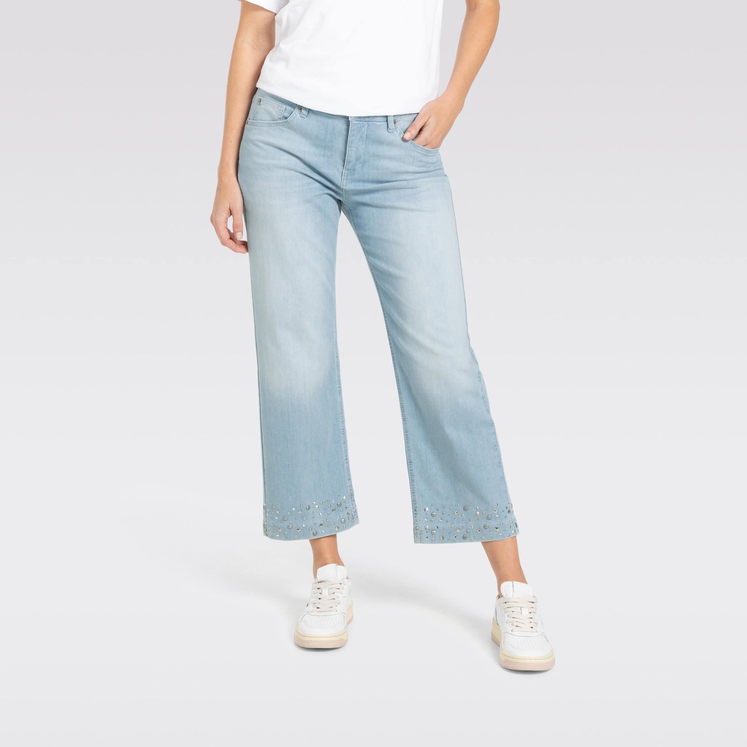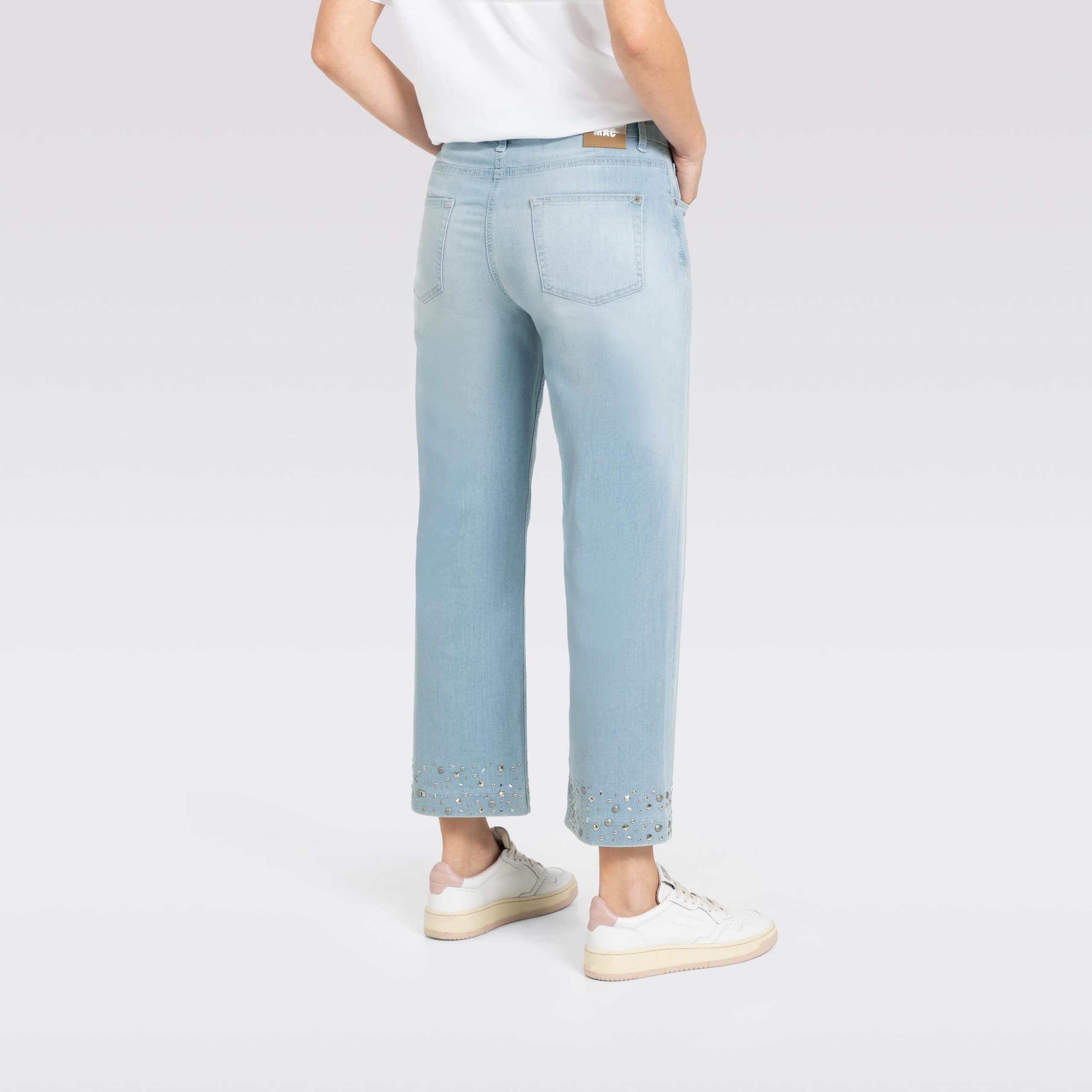 Lichtblauwe jeans van MAC, model Culotte hem glam. Deze culotte broek heeft een normale taille en een 7/8 lengte met wijde pijpen met aan de onderzijde zilveren studs. De jeans sluit met een knoop- en ritssluiting, heeft twee steekzakken en twee achterzakken.