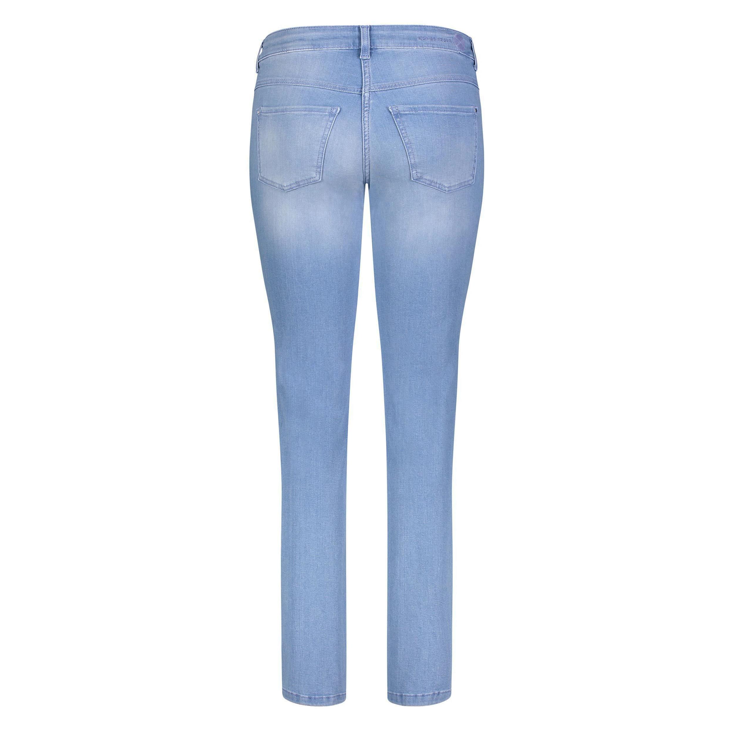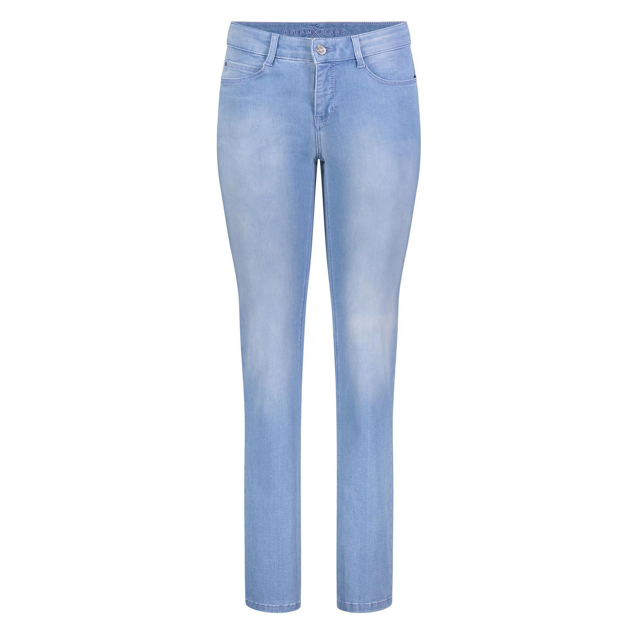Lichtblauwe jeans van MAC, model Dream in basic bleached blue. Deze denim broek heeft een normale taille, twee steekzakken aan de voorzijde, twee achterzakken en sluit met een knoop- en ritssluiting. De jeans is gemaakt van lichtblauwe denim stretch stof en heeft een rechte pasvorm.