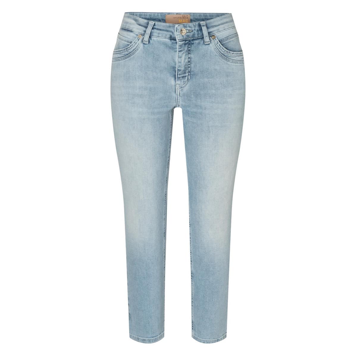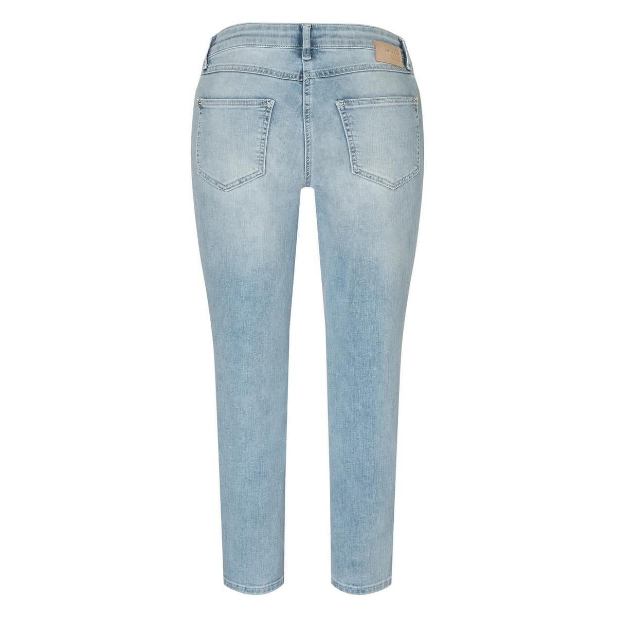 Lichtblauwe jeans van MAC x Sylvie Meis 24/7, model Mel feminine fit slim leg in summer blue bleached wash. Deze denim broek heeft een iets verhoogde smalle taille met een slim fit pasvorm. De jeans sluit met een knoop- en ritssluiting, heeft twee steekzakken en twee achterzakken.