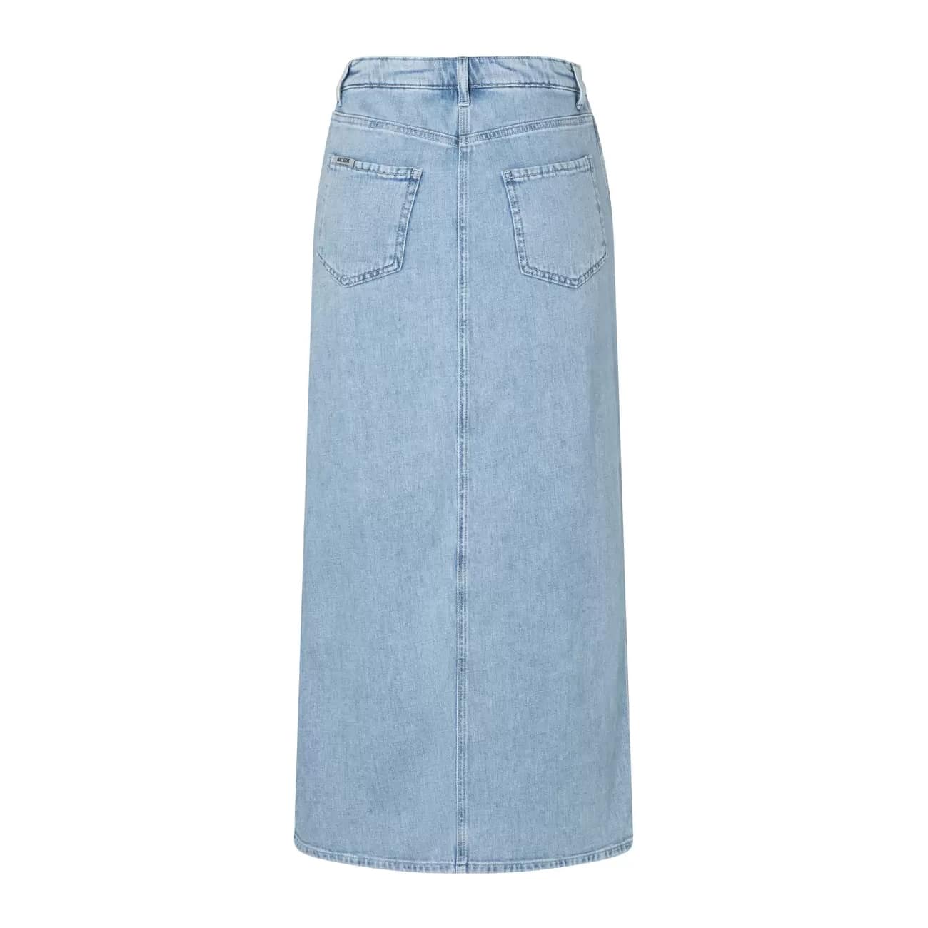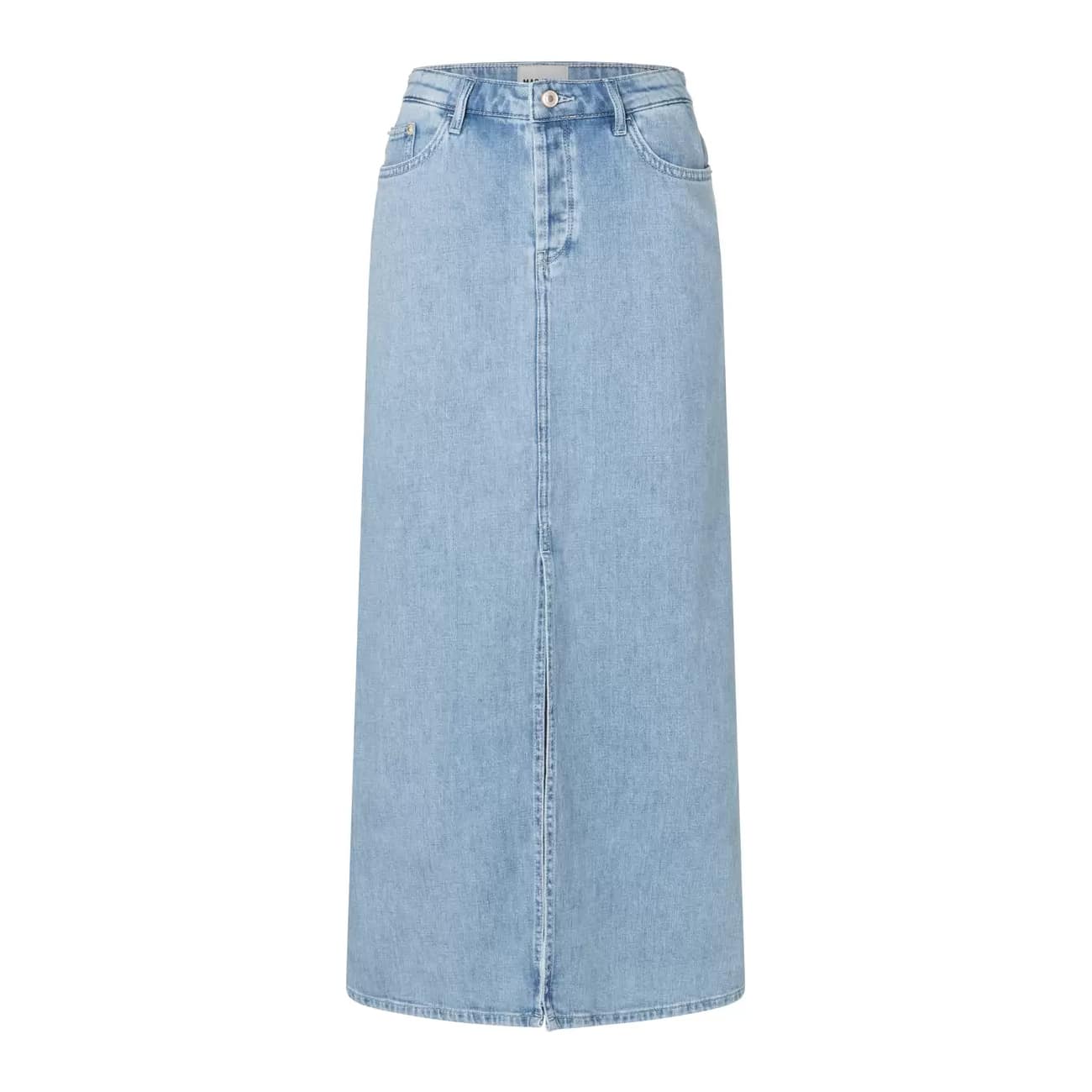 Lichtblauwe maxi rok van MAC, model Maxi skirt in clean light blue wash. Deze maxi spijkerrok is gemaakt van denim met een beetje stretch en heeft een iets uitlopende pasvorm met split aan de voorzijde. De lange rok sluit met een knoopsluiting, heeft twee steekzakken aan de voorzijde en twee achterzakken.