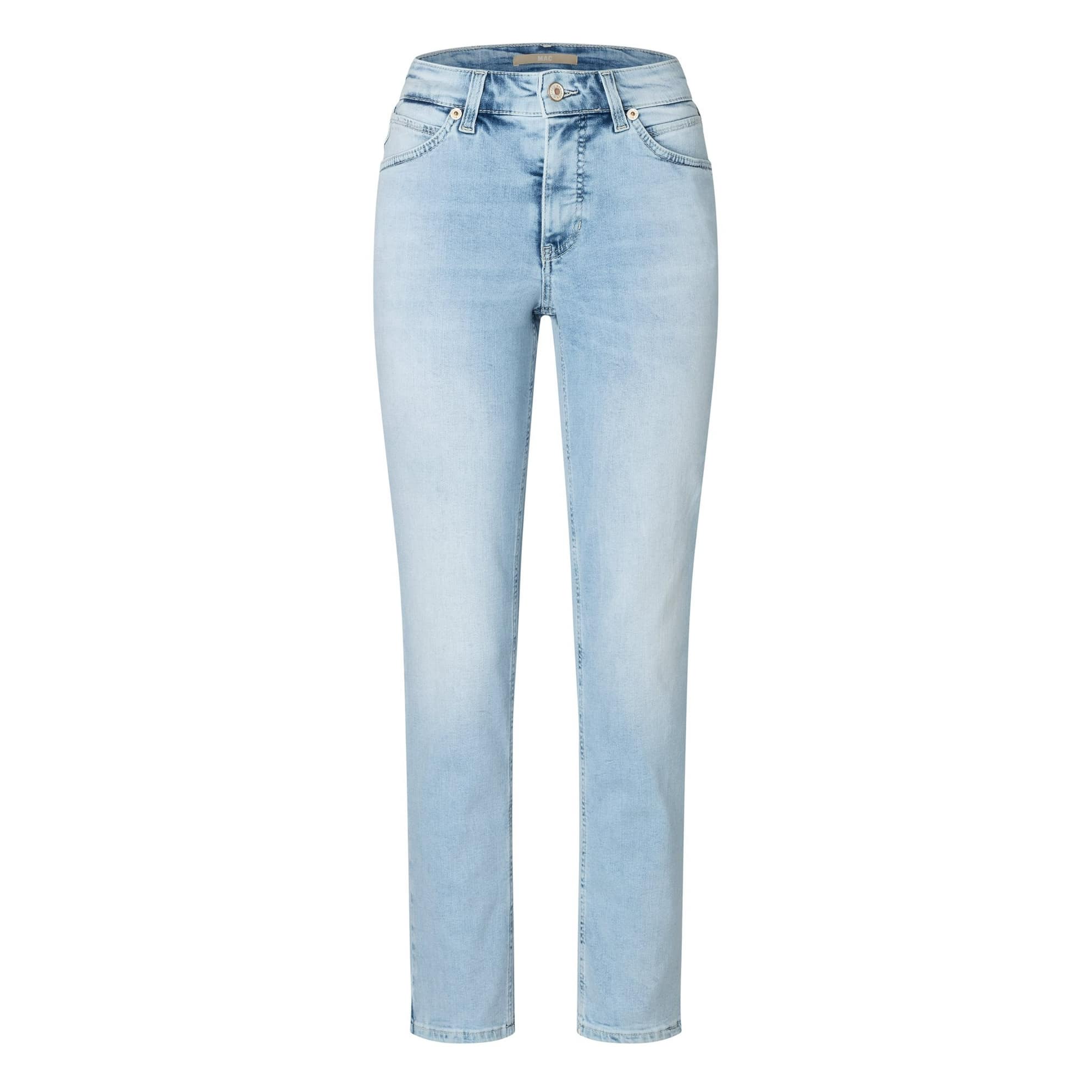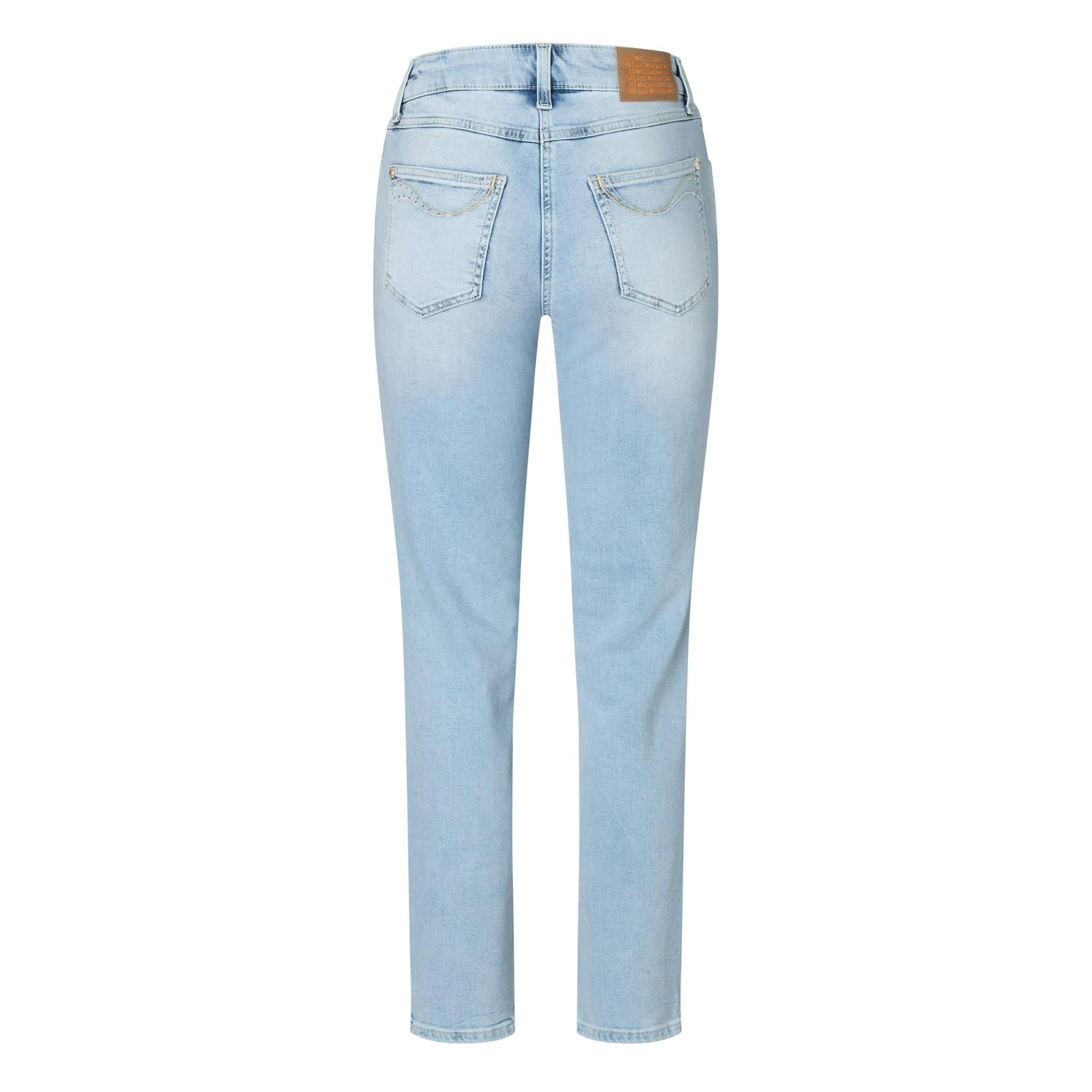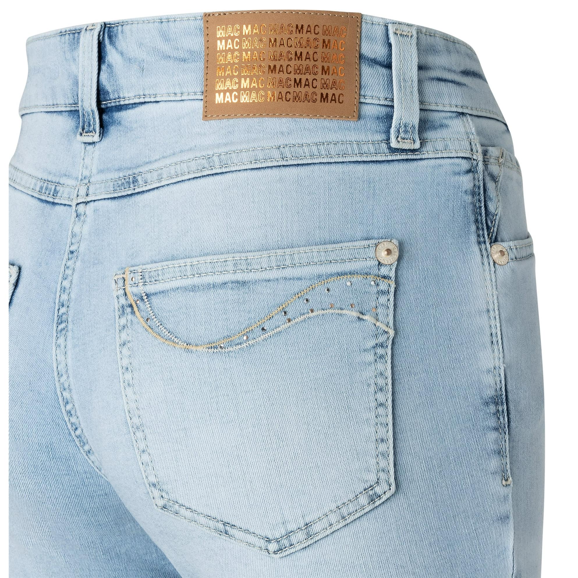 Lichtblauwe jeans van MAC, model Melanie swing, feminine fit, straight leg. Deze rechte 7/8 jeans is gemaakt van stretch denim, heeft twee steekzakken aan de voorzijde en twee achterzakken die versiert zijn met kleine steentjes. De jeans sluit met een knoop- en ritssluiting en heeft een hogere taille.