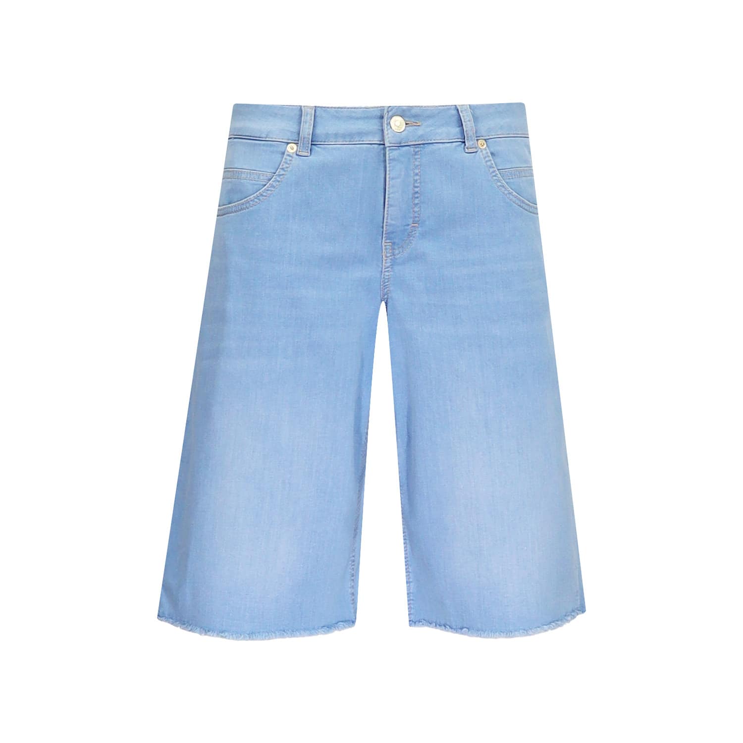 Lichtblauwe bermuda van MAC, model Rich Bermuda, wide leg. Deze korte broek is gemaakt van een stretch denim en heeft korte wijde broekspijpen. De short sluit met een knoop- en ritssluiting, heeft twee steekzakken, twee achterzakken en een fijn gerafelde zoom.