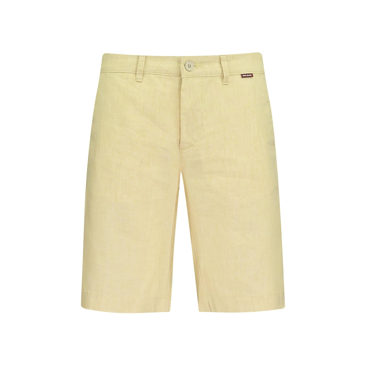 Lichtgele short van MAC, model Lenny short. Deze short is gemaakt van een mix met linnen en heeft een normale taille. De korte broek sluit met een knoop- en ritssluiting en heeft twee steekzakken en twee paspelzakken.