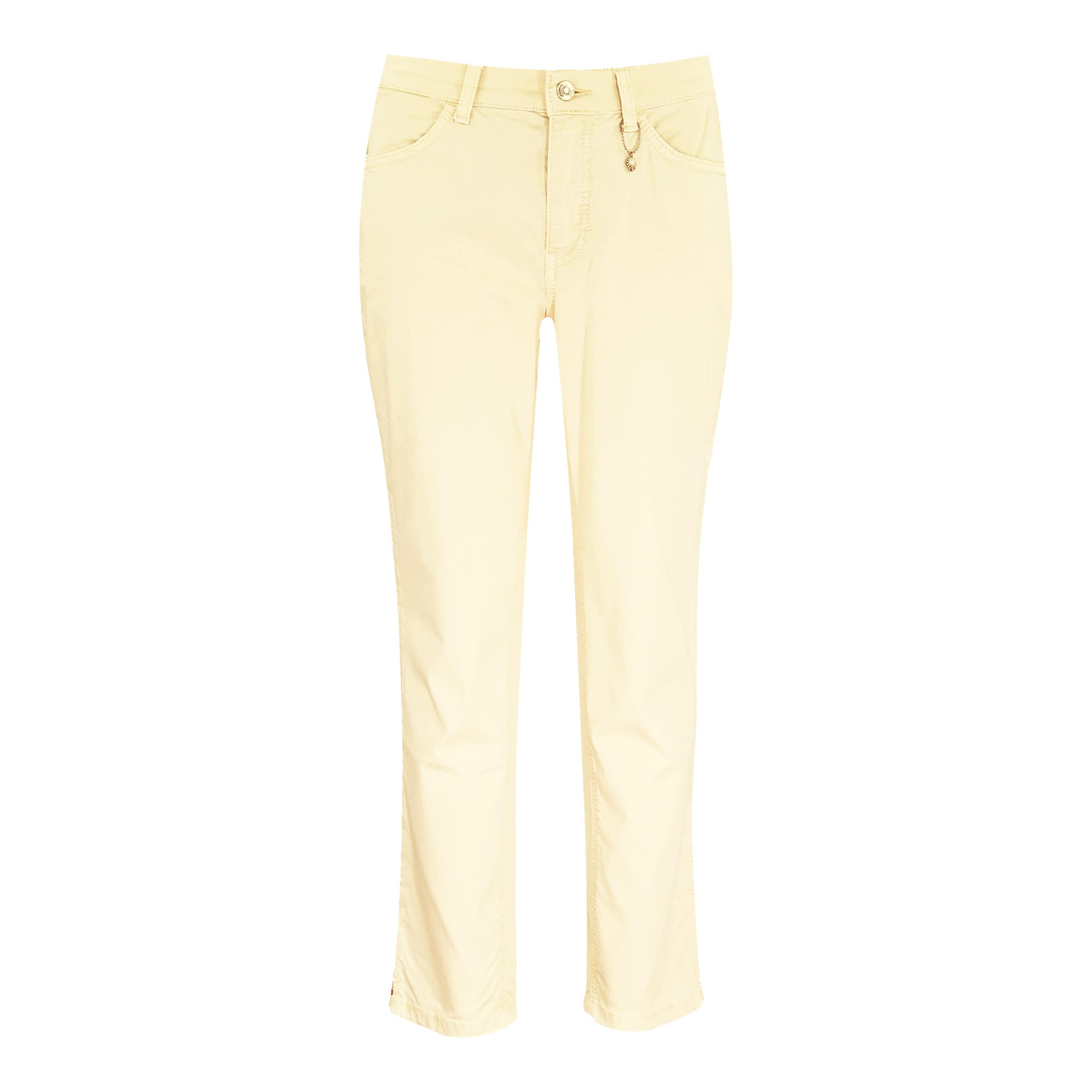 Lichtgele pantalon van MAC, model Melanie 7/8, feminine fit, slim leg. Deze rechte 7/8 broek is gemaakt van katoenen stretch stof, heeft twee steekzakken aan de voorzijde, twee achterzakken en en kleine splitjes in de zoom. De jeans sluit met een knoop- en ritssluiting en heeft een hogere taille.