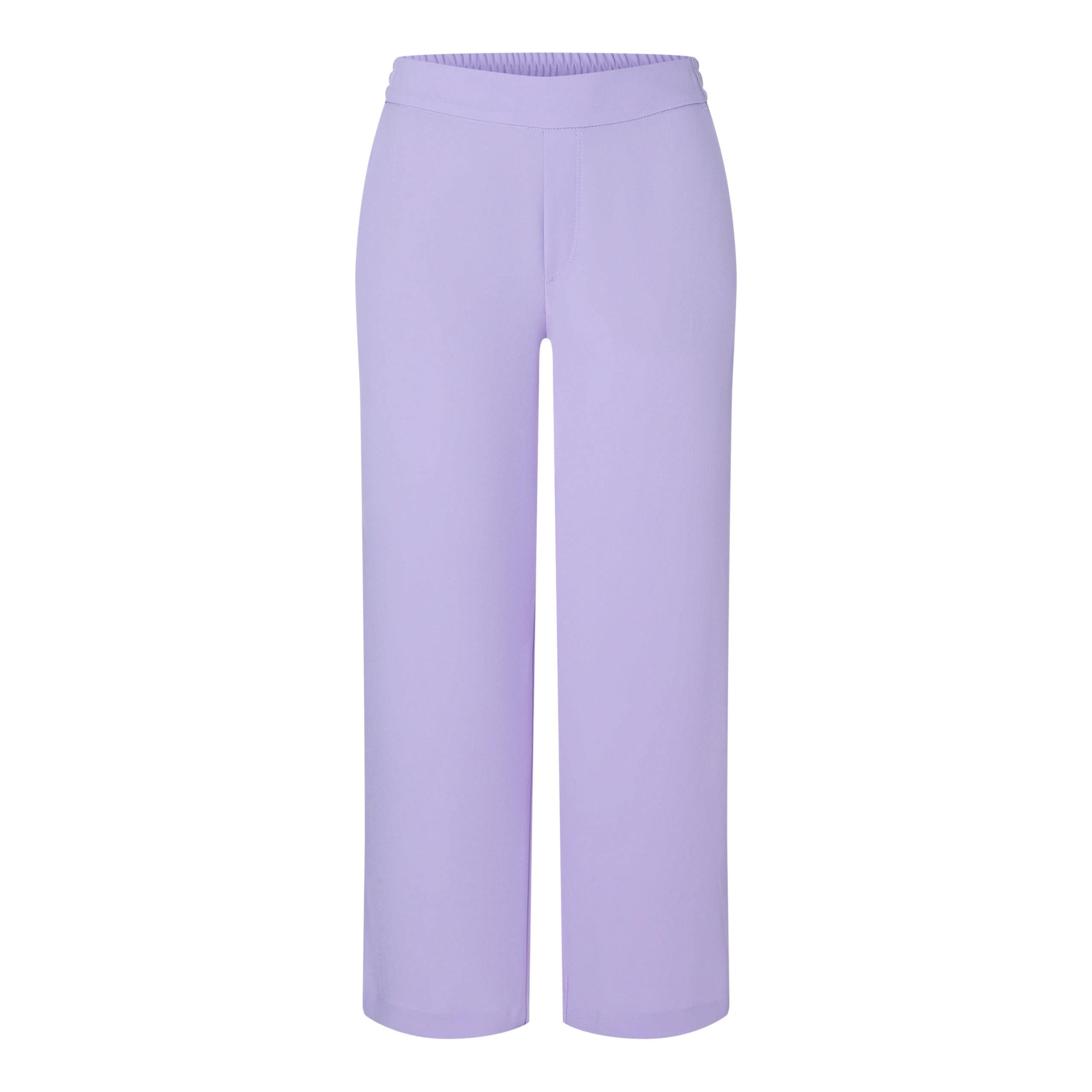 Lila pantalon van MAC, model Chiara cropped in light lavender. Deze relaxte pantalon is gemaakt van een dunne soepelvallende stof en heeft wijde rechte broekspijpen. De losvallende lange broek heeft een elastische taille en twee steekzakken.