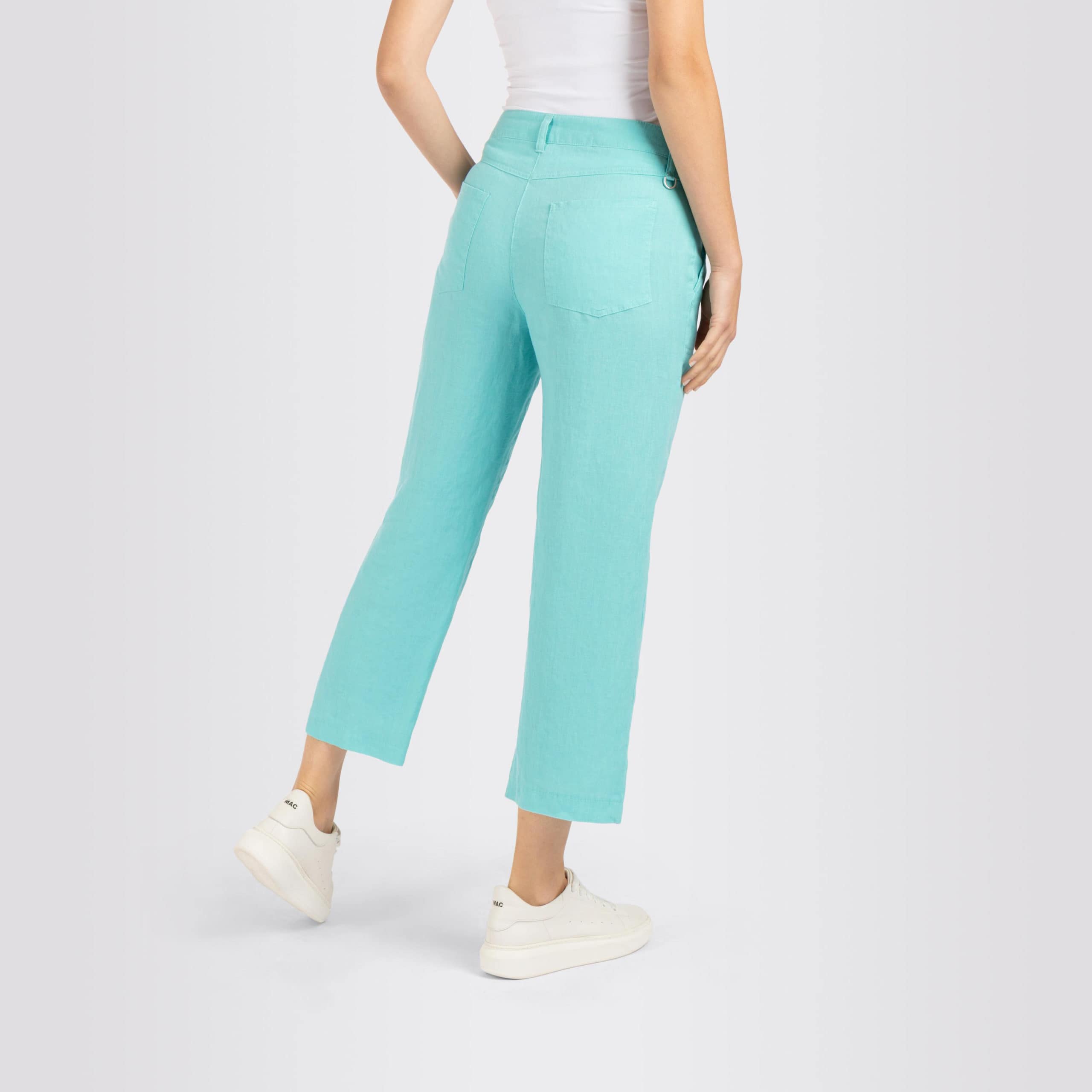Wijde pantalon van MAC, model Nora cropped. Deze 7/8 broek is gemaakt van een linnen stof in aqua blue en heeft rechte wijde broekspijpen. De broek sluit met een knoop- en ritssluiting en heeft twee steekzakken en twee achterzakken.