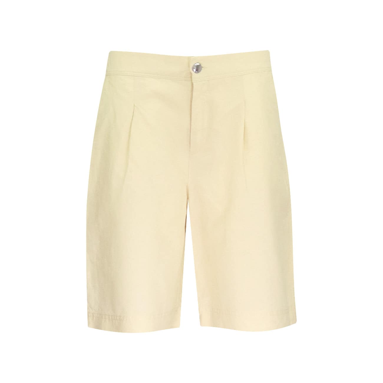 Lichtgele short van MAC, model Suvi. Deze korte broek is gemaakt van een linnen mix en heeft een relaxte pasvorm. De bermuda sluit met een knoop- en ritssluiting, is geplooid aan de voorzijde en heeft twee steekzakken.