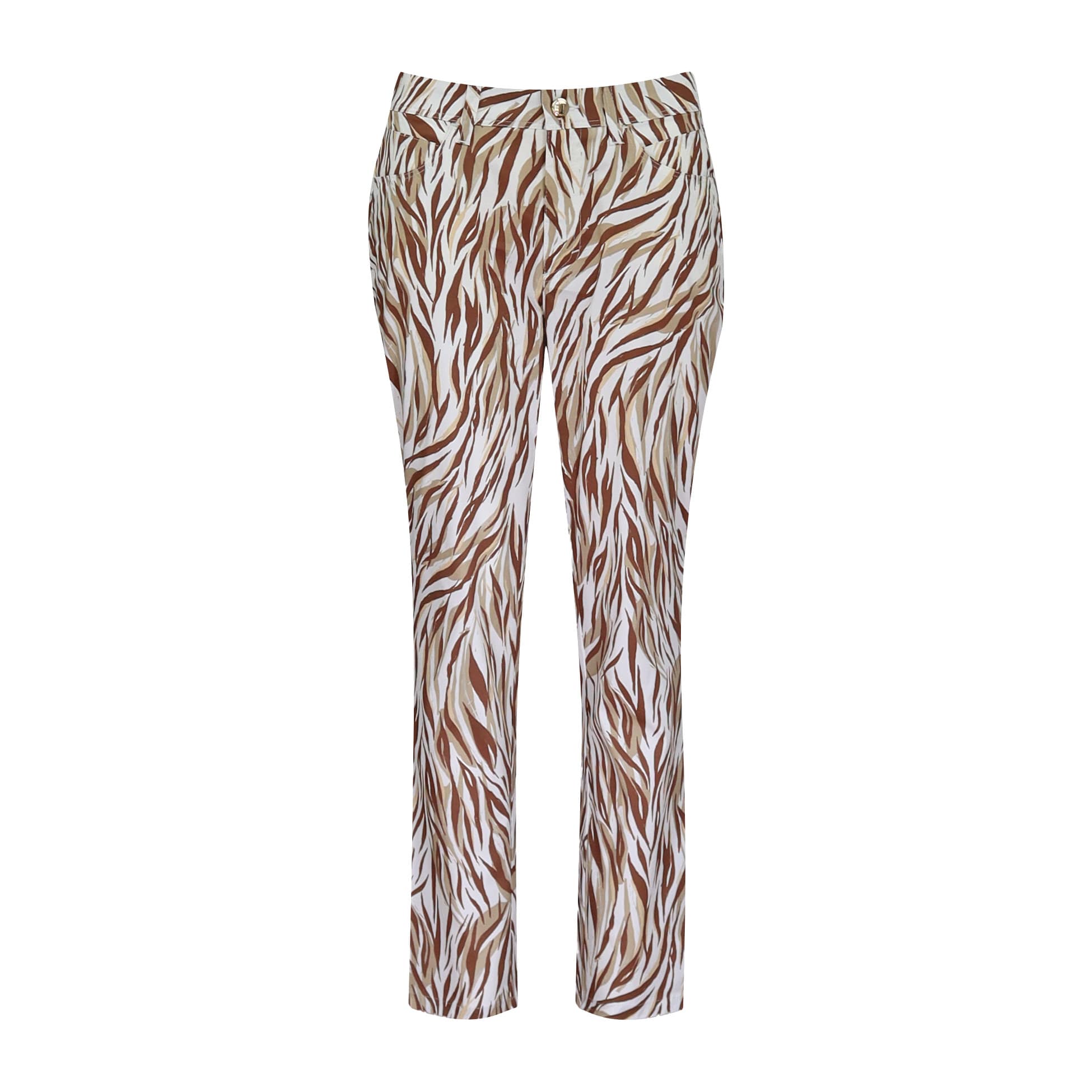 Wit, bruine pantalon van MAC, model Melanie, feminine fit, slim leg. Deze slim fit broek heeft twee steekzakken aan de voorzijde en twee achterzakken. De jeans is gemaakt van stretch katoen, sluit met een knoop- en ritssluiting en heeft een hogere taille.