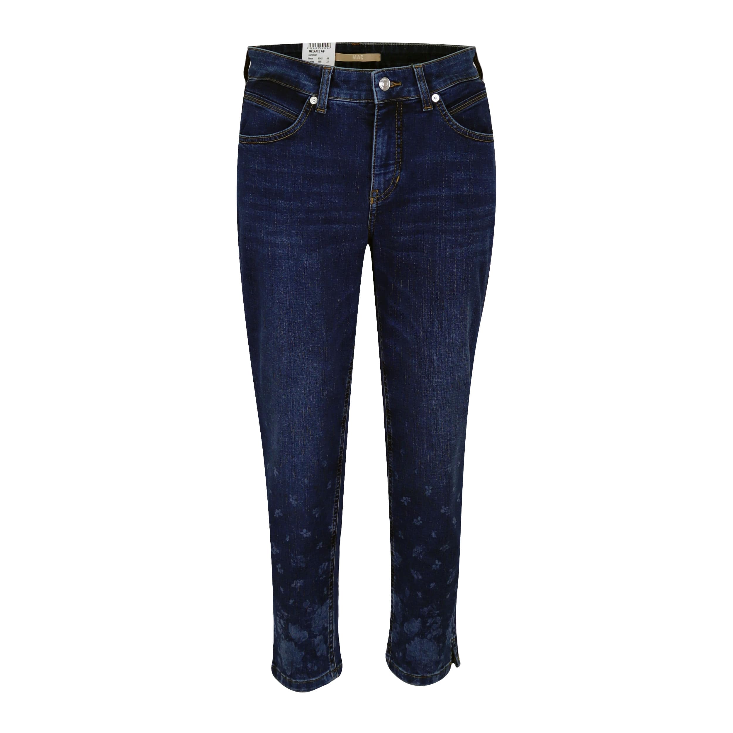 Donkerblauwe jeans van MAC, model Melanie 7/8 Summer feminine fit slim leg. Deze rechte 7/8 jeans is gemaakt van stretch denim, heeft twee steekzakken aan de voorzijde, twee achterzakken en en kleine splitjes in de zoom. De jeans sluit met een knoop- en ritssluiting, heeft een hoge taille en decoratieve licht blauwe bloemen aan de onderzijde van de broekspijpen.