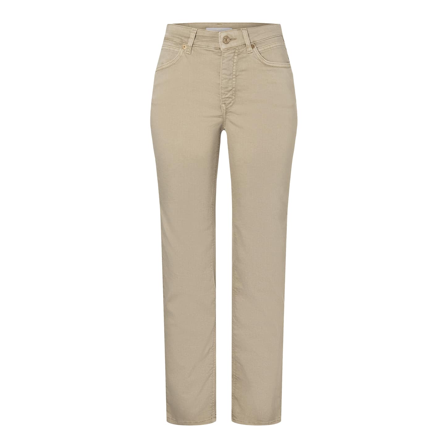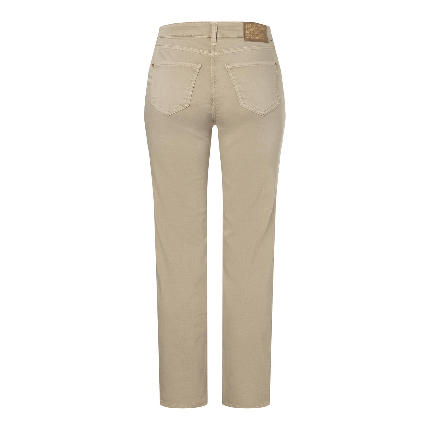 Beige jeans van MAC, model Melanie, feminine fit, slim leg. Deze slim fit broek heeft twee steekzakken aan de voorzijde en twee achterzakken. De jeans is gemaakt van stretch denim, sluit met een knoop- en ritssluiting en heeft een hogere taille.