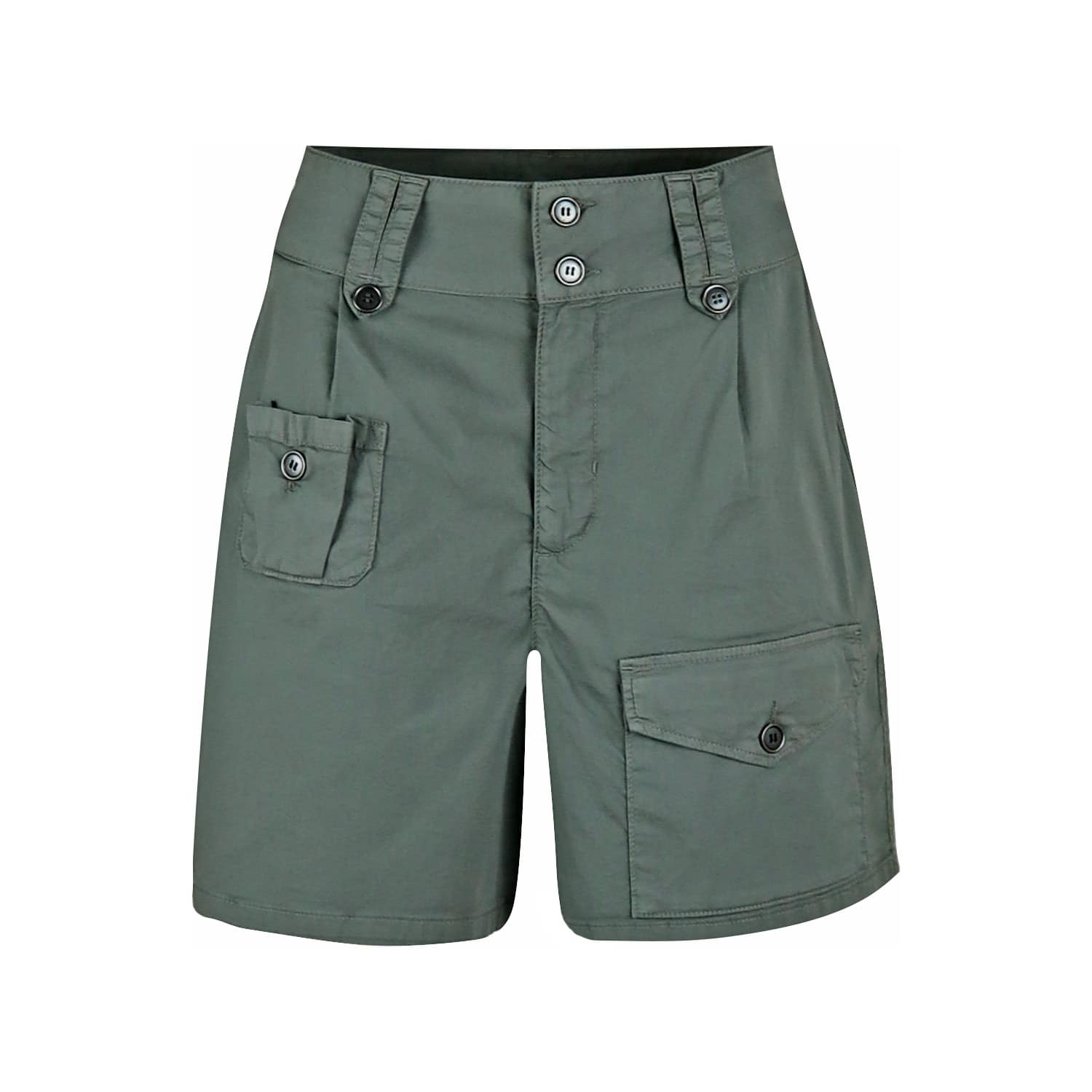 Wijde shorts van MAC, model Mikka. Deze korte broek  is gemaakt van een groen / grijze katoenen stretch stof. De broek sluit met een dubbele knoop- en ritssluiting en heeft twee klepzakken aan de achterzijde. Aan de voorzijde zit een klepzak op het bovenbeen en een zakje met knoop.