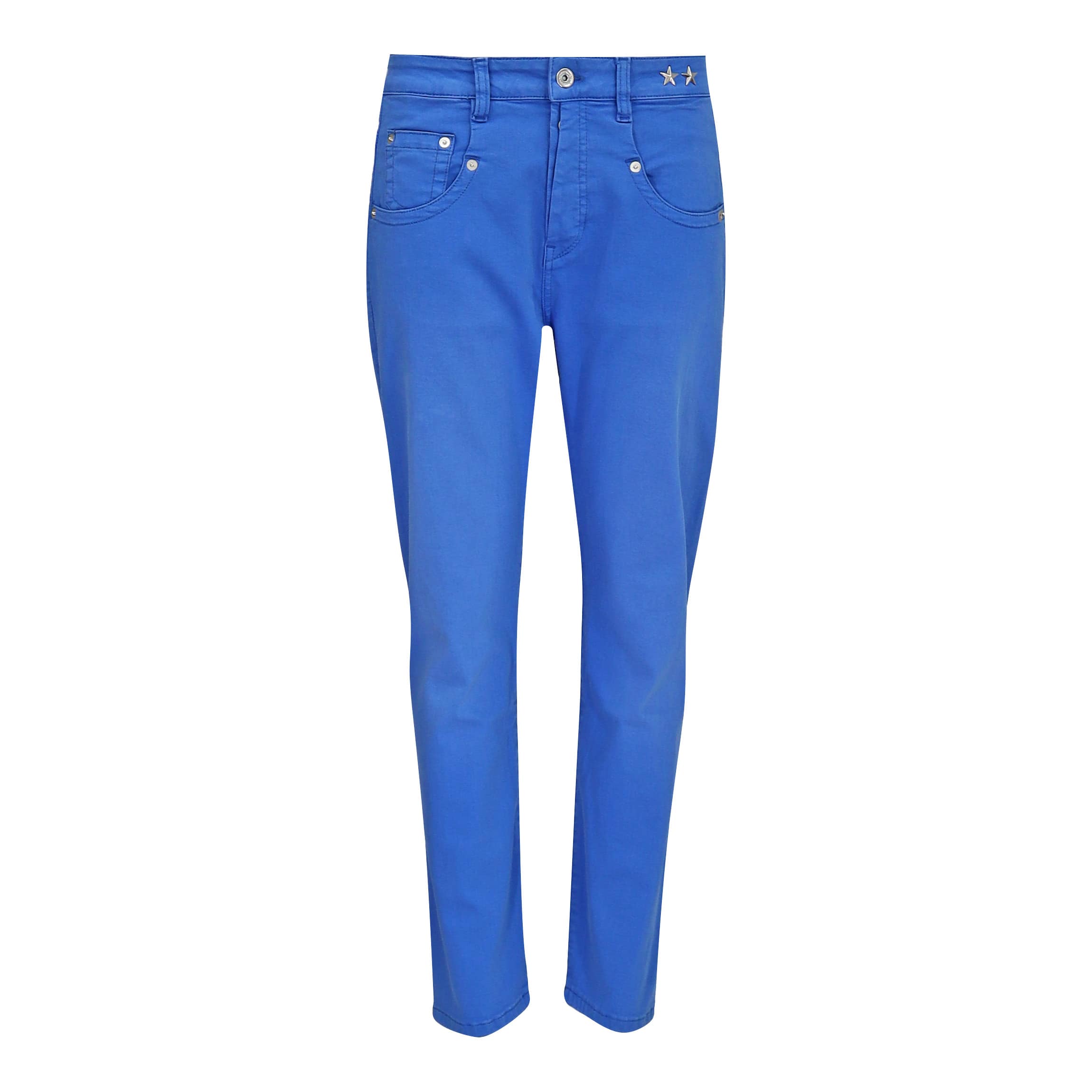 Blauwe jeans van MAC No.1, model Boyfriend button. Deze spijkerbroek is gemaakt van stretch denim, heeft een hogere taille en relaxte boyfriend pasvorm. De jeans sluit met een knoopsluiting, heeft twee steekzakken en twee achterzakken.