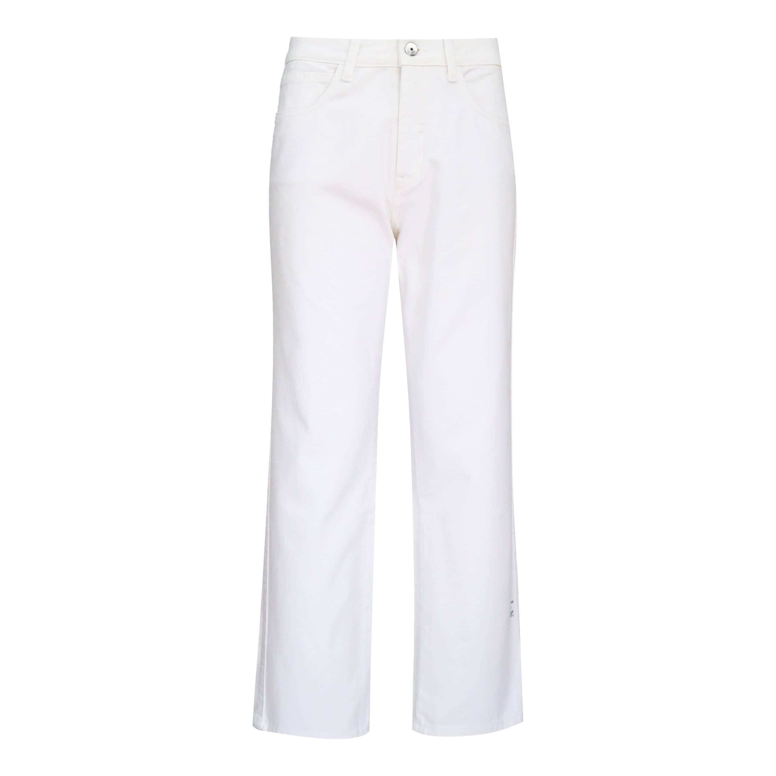 Witte jeans van MAC No.1, model Straight. Deze spijkerbroek is gemaakt van denim stof, heeft een hoge taille en rechte broekspijpen. Een van deze broekspijpen heeft in het lichtgrijs aan de zijkant klein No.1 staan. De jeans sluit met een knoop- en ritssluiting, heeft twee steekzakken en twee achterzakken.