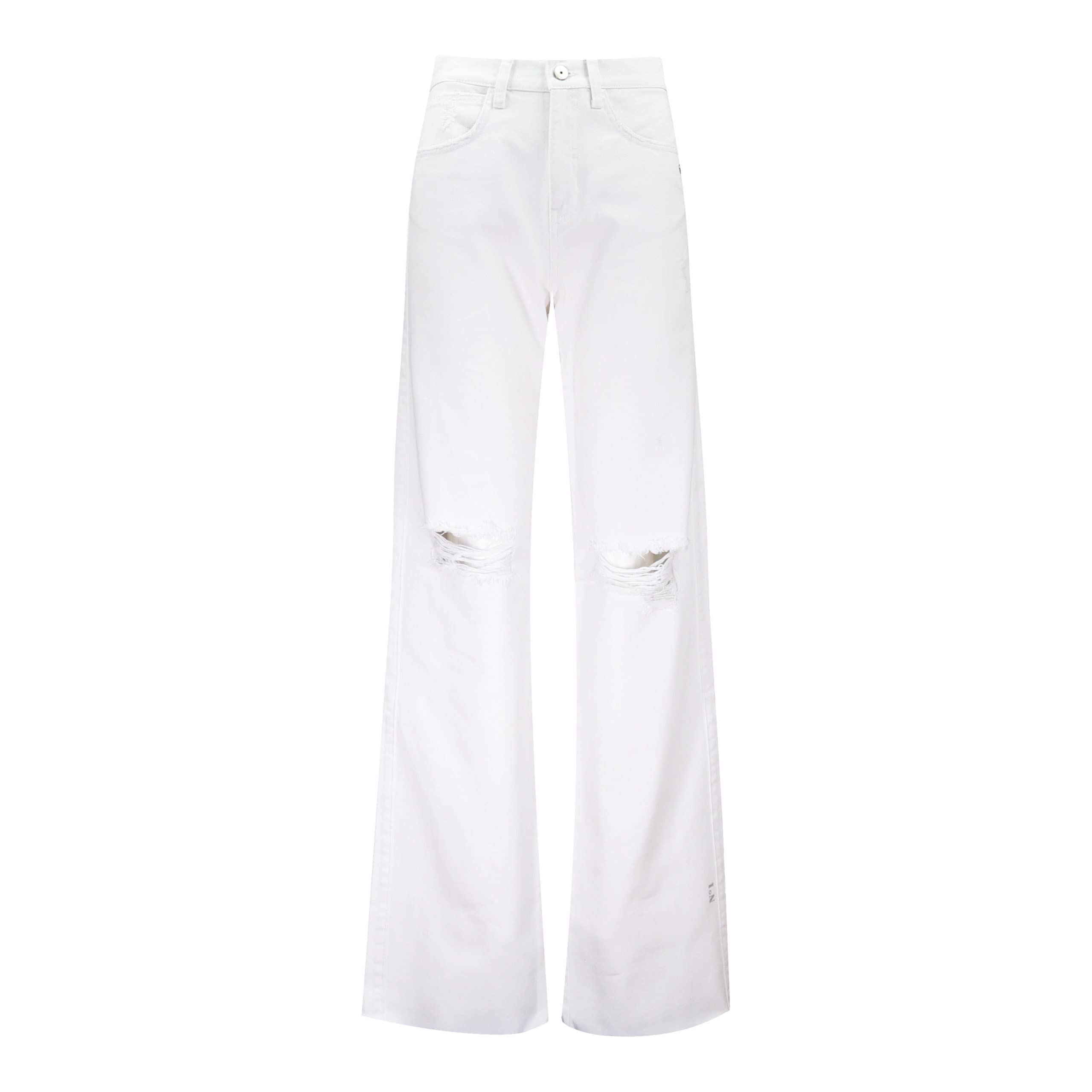 Witte wideleg jeans van MAC No.1, model Wideleg. Deze effen witte denim broek heeft een hoge taille, beschadigingen met open knieën en wijde onafgewerkte broekspijpen. De jeans sluit met een knoop- en ritssluiting, heeft twee steekzakken en twee achterzakken.