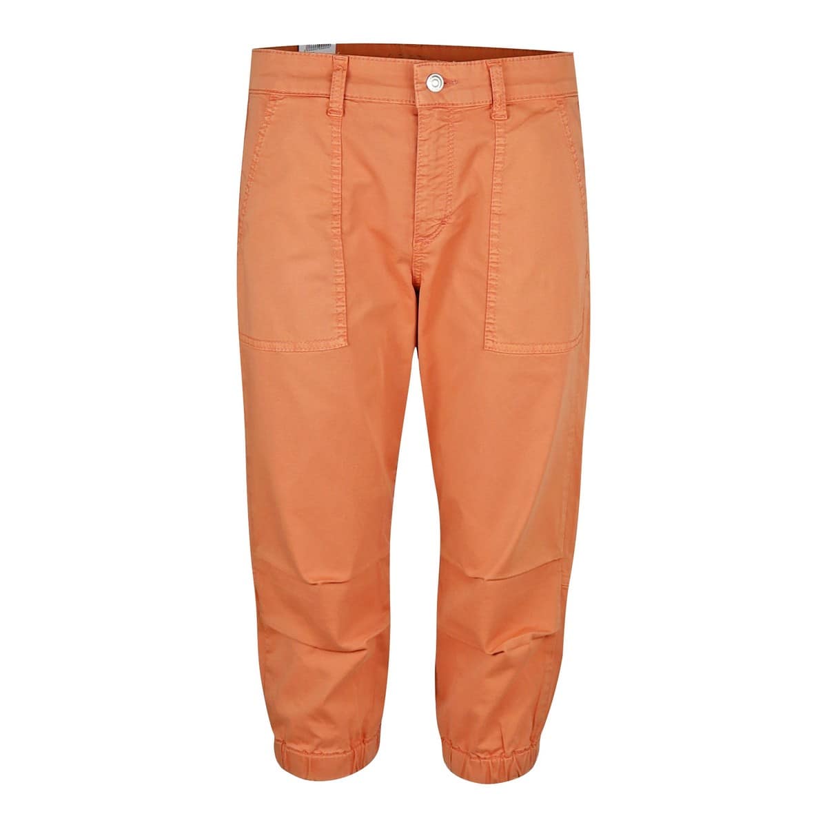 Oranje capri broek van MAC, model Capri slouchy relaxed slim fit tapered leg. Deze katoenen broek valt net onder de knie en heeft een losse slim fit pasvorm. De broek sluit met een knoop- en ritssluiting en heeft twee steekzakken aan de voorzijde en twee achterzakken. De zoom van deze capri broek is elastisch.