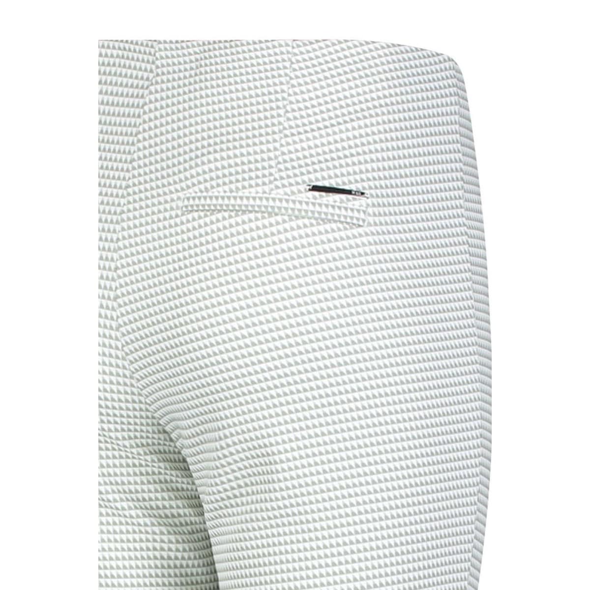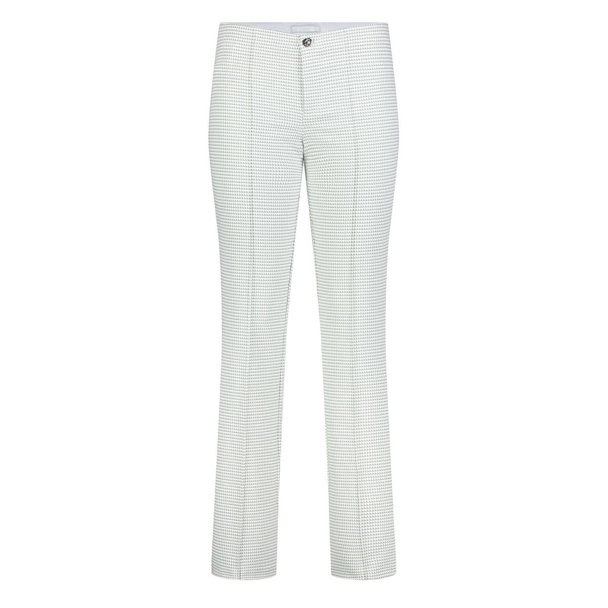Wit met kaki pantalon van MAC, model Anna Boot. Deze slim fit broek met bootcut heeft een elastische taille en is gemaakt van een stof met een driehoekjes motief. De broek sluit met een knoop- en ritssluiting en heeft twee sier paspelzakjes. Aan de voorzijde loopt er een naad over de broekspijpen die ervoor zorgt dat je benen langer lijken.
