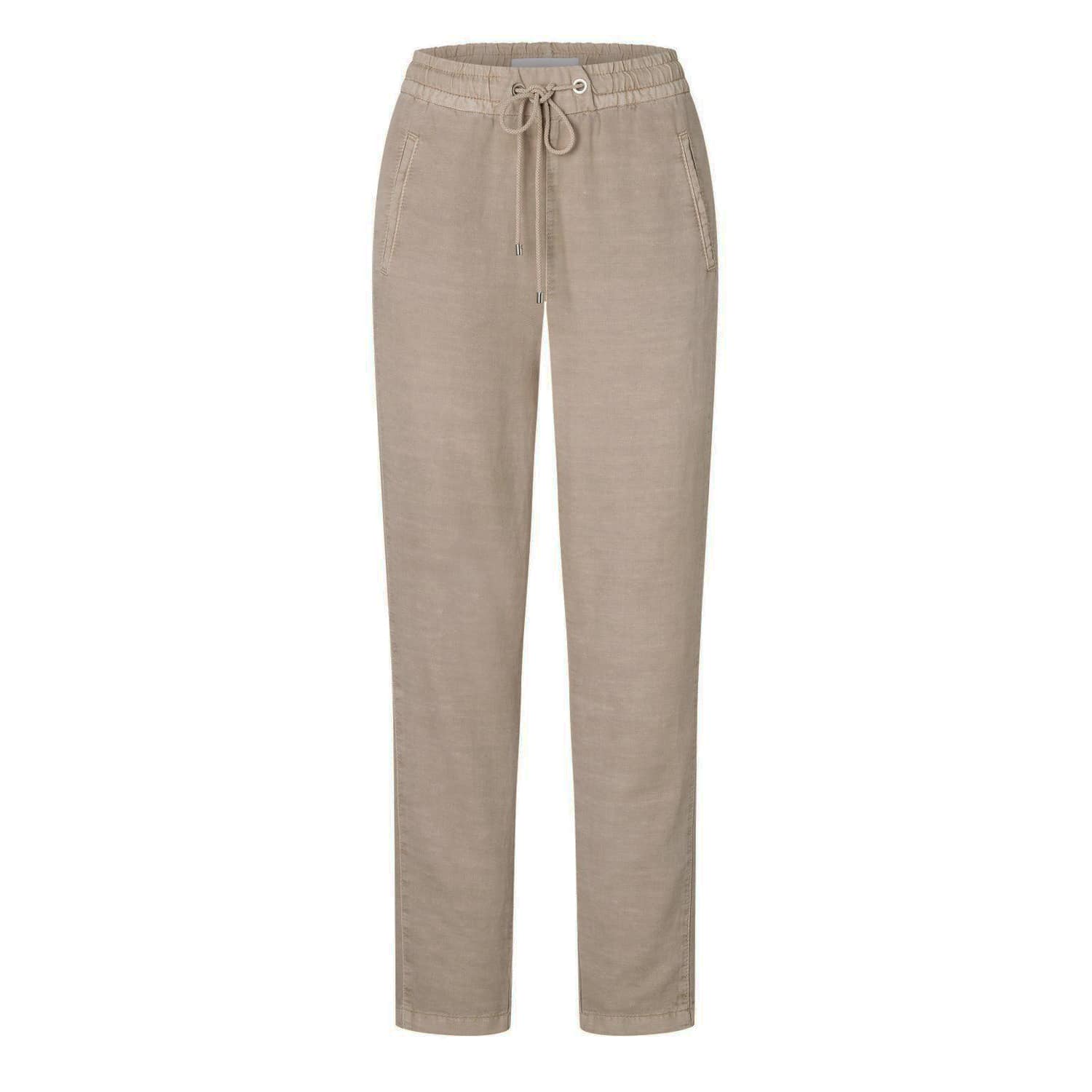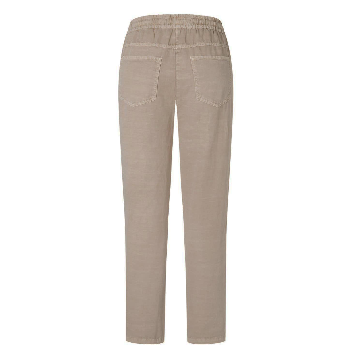 Relaxte cropped pantalon van MAC, model Easy chino. Deze beige broek is gemaakt van katoen, lyocell en linnen stof mix en valt boven de enkels. De pantalon heeft een elastische taille met trekkoord, twee steekzakken en twee achterzakken.