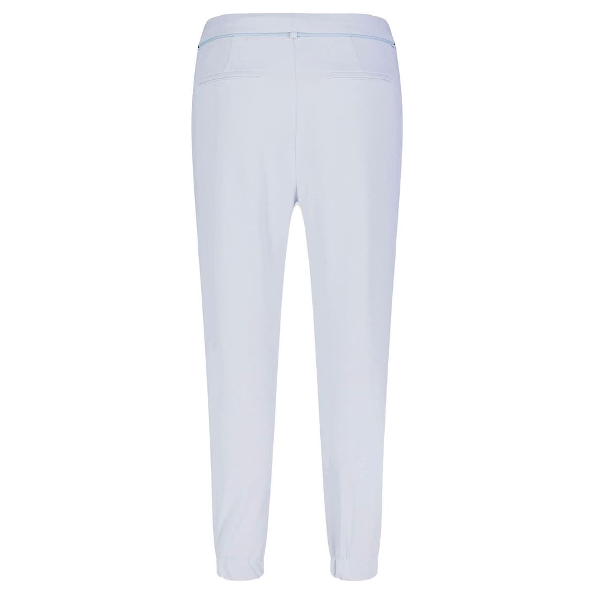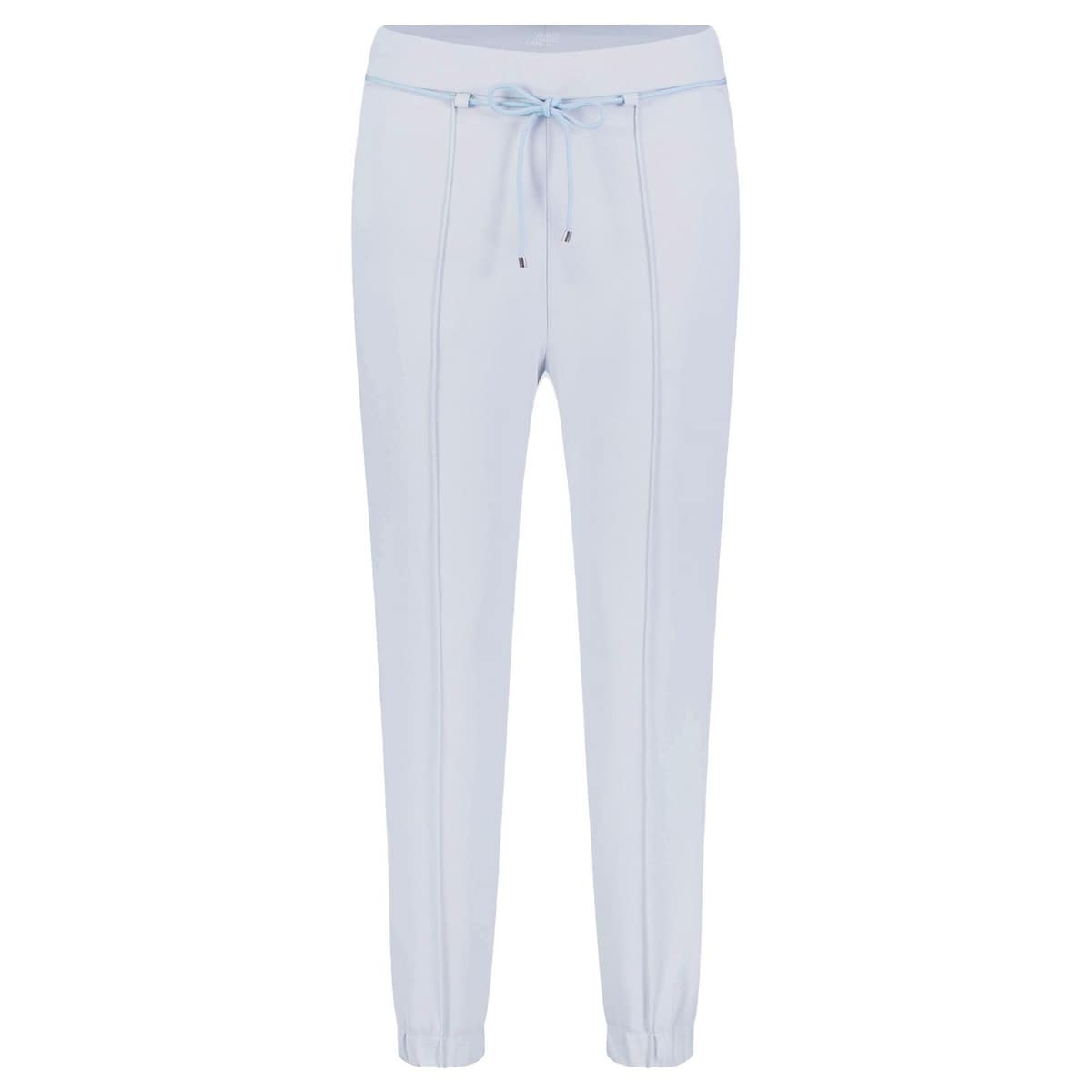 Relaxte broek van MAC, model Essential in ice flow. Deze slim fit broek is gemaakt van een comfortabele stretch stof en heeft een elastische taille met een elegant trekkoordje. De broek heeft twee steekzakken aan de voorzijde en twee sier paspelzakjes.