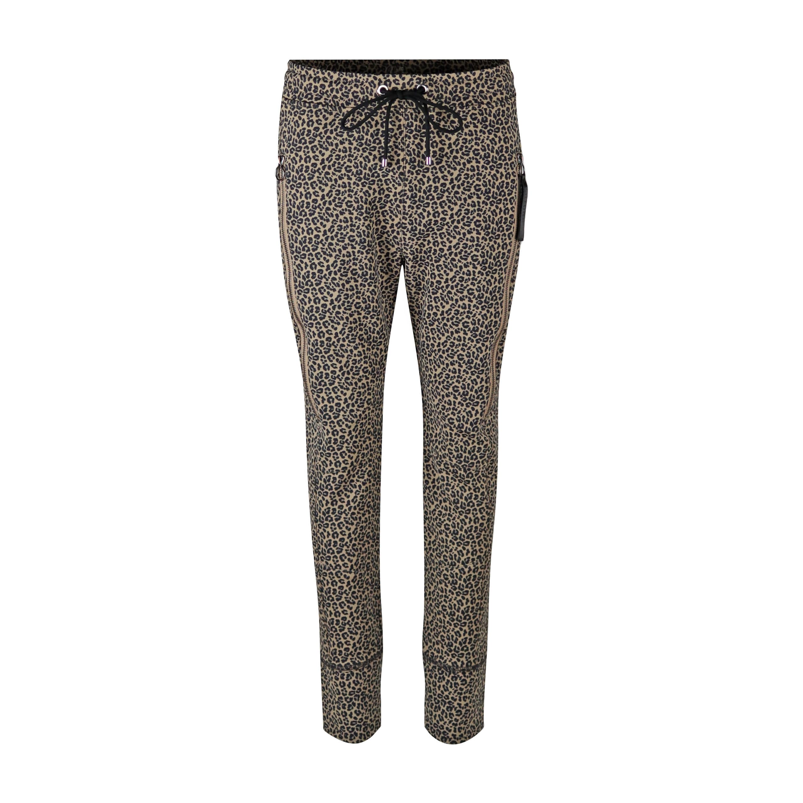 Relaxte pantalon van MAC Jeans, model Future 2.0. Deze broek is gemaakt van een soepel vallende stof met een luipaard print en heeft een elastische tailleband met trekkoord. De broek heeft taps toelopende broekspijpen met twee zakken achter ritsjes aan de voorzijde.