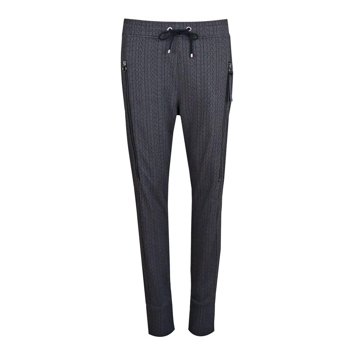 Relaxte pantalon van MAC Jeans, model Future 2.0 met letter print. Deze broek heeft herhalend de woorden only love in zwarte letters op een grijze ondergrond. De broek heeft taps toelopende broekspijpen met twee zakken achter ritsjes aan de voorzijde,is gemaakt van een soepelvallende stof en heeft een tailleband met trekkoord.