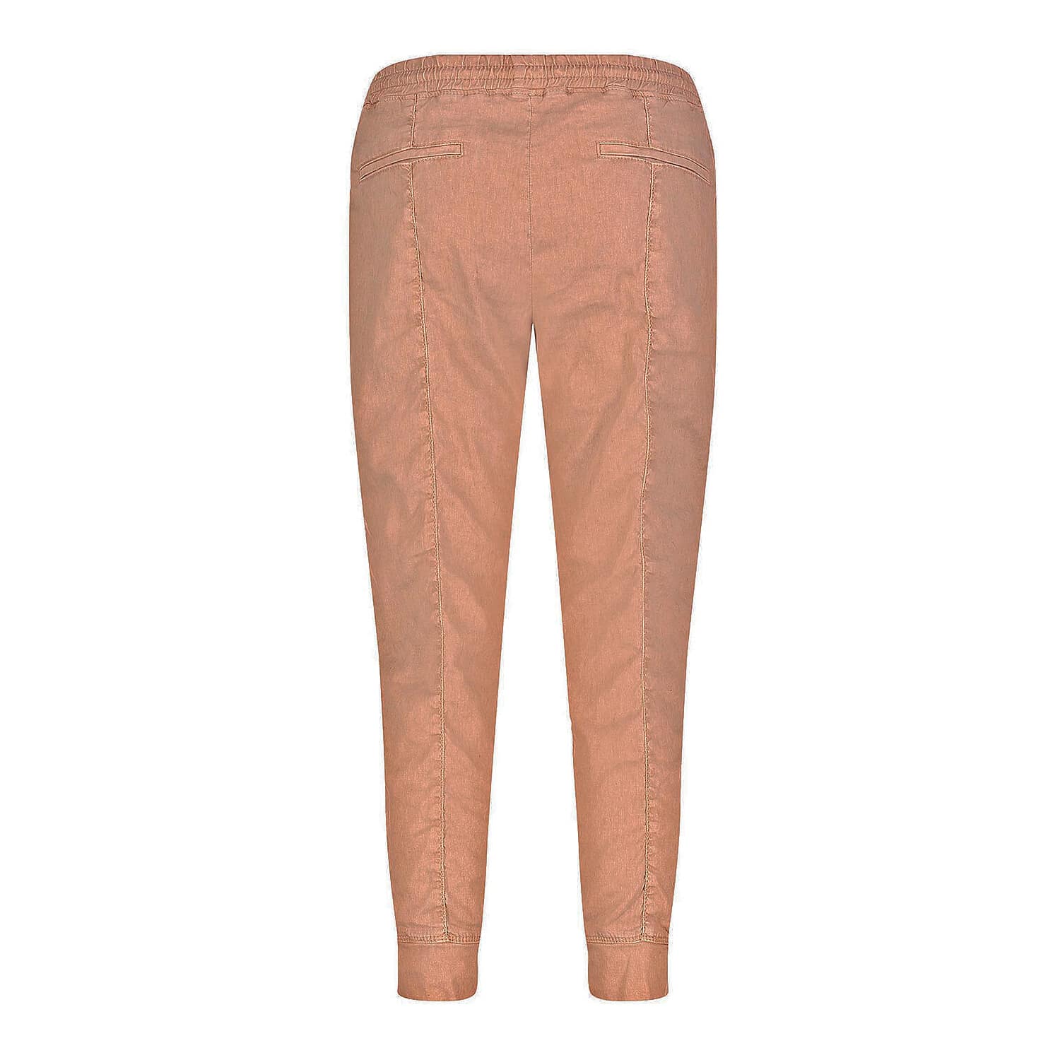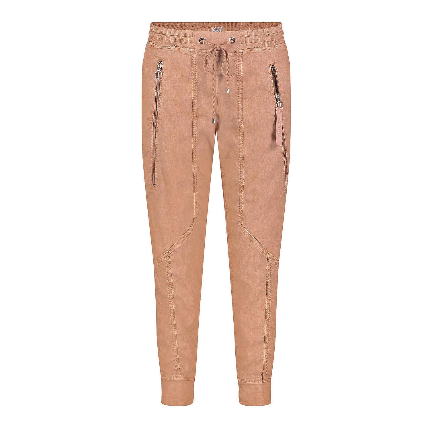 Relaxte pantalon van MAC Jeans, model Future Worker. Deze broek in terracotta is gemaakt van een soepelvallende stof die bestaat uit een mix van lyocell en linnen. De broek heeft taps toelopende broekspijpen met twee zakken achter ritsjes aan de voorzijde en een elastische tailleband met trekkoord.