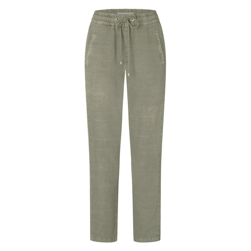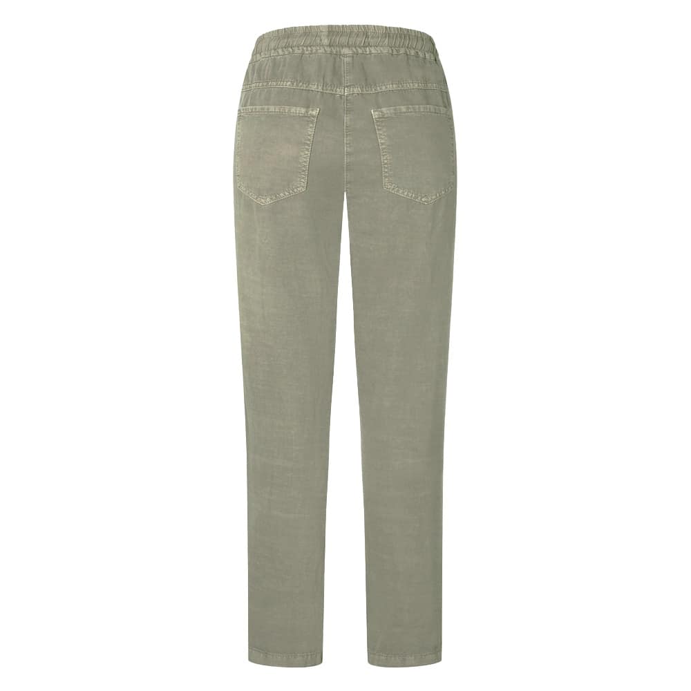 Relaxte cropped pantalon van MAC, model Easy chino in green tea PPT. Deze kaki groene broek is gemaakt van katoen, lyocell en linnen stof mix en valt boven de enkels. De pantalon heeft een elastische taille met trekkoord, twee steekzakken en twee achterzakken.