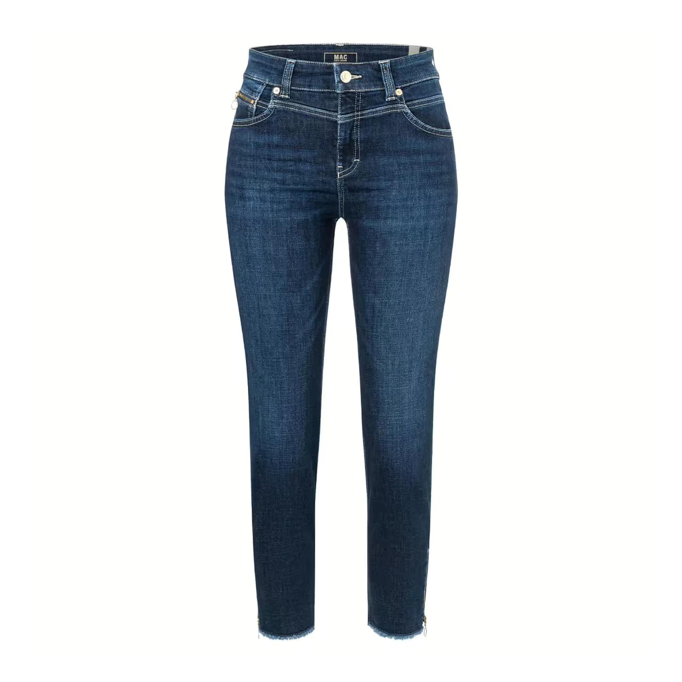 Donkerblauwe jeans van MAC, model Rich Slim chic, straight fit, slim leg in new basic wash. Deze 7/8 jeans heeft een slim fit pasvorm met twee steekzakken en twee achterzakken. De broek is gemaakt van blauwe denim stretch stof en sluit met een knoop- en ritssluiting. De onderzijde van de broekspijpen zijn gerafeld en hebben een ritsje aan de zijkant.