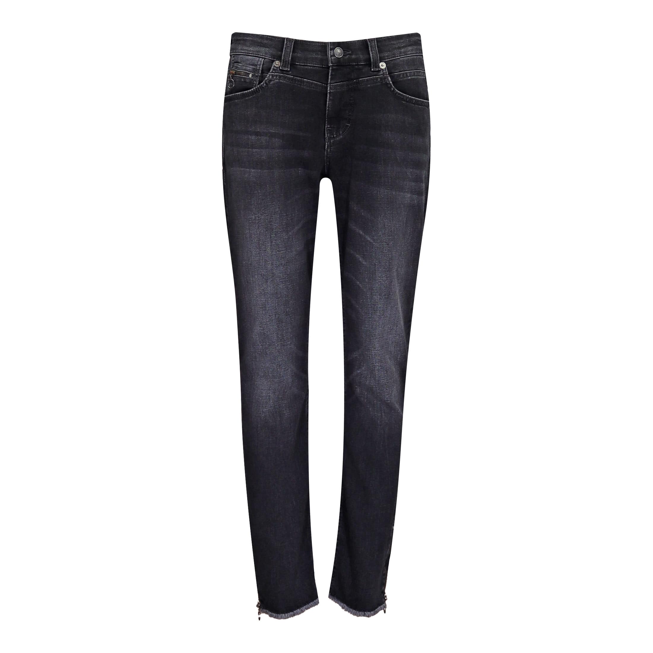 Donkergrijze jeans van MAC, model Rich Slim chic, straight fit, slim leg in dark grey used. Deze 7/8 jeans heeft een slim fit pasvorm met twee steekzakken en twee achterzakken. De broek is gemaakt van donkergrijze denim stretch stof en sluit met een knoop- en ritssluiting. De onderzijde van de broekspijpen zijn gerafeld en hebben een ritsje aan de zijkant.