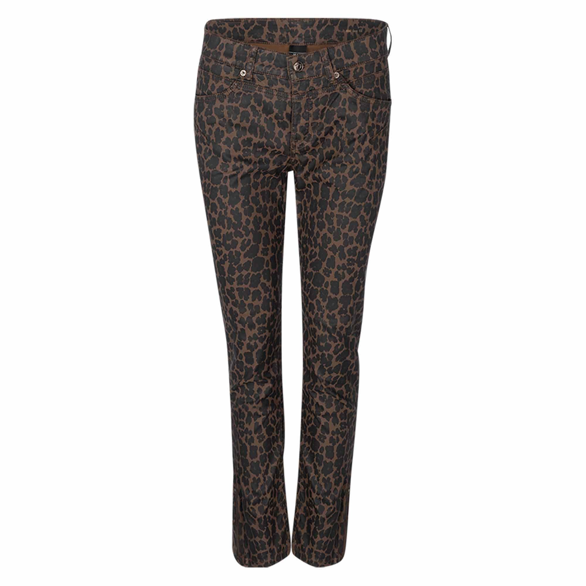 Bruin, zwarte jeans van MAC, model Rich Slim Chic coating, straight fit slim leg in cocoa leo. Deze 7/8 broek heeft een slim fit pasvorm met twee steekzakken aan de voorzijde en twee achterzakken. De broek is gemaakt van een stretch stof met een luipaard coating in bruin en zwart en sluit met een knoop- en ritssluiting. Aan de onderzijde van de broekspijpen zitten ritsjes aan de zijkanten.