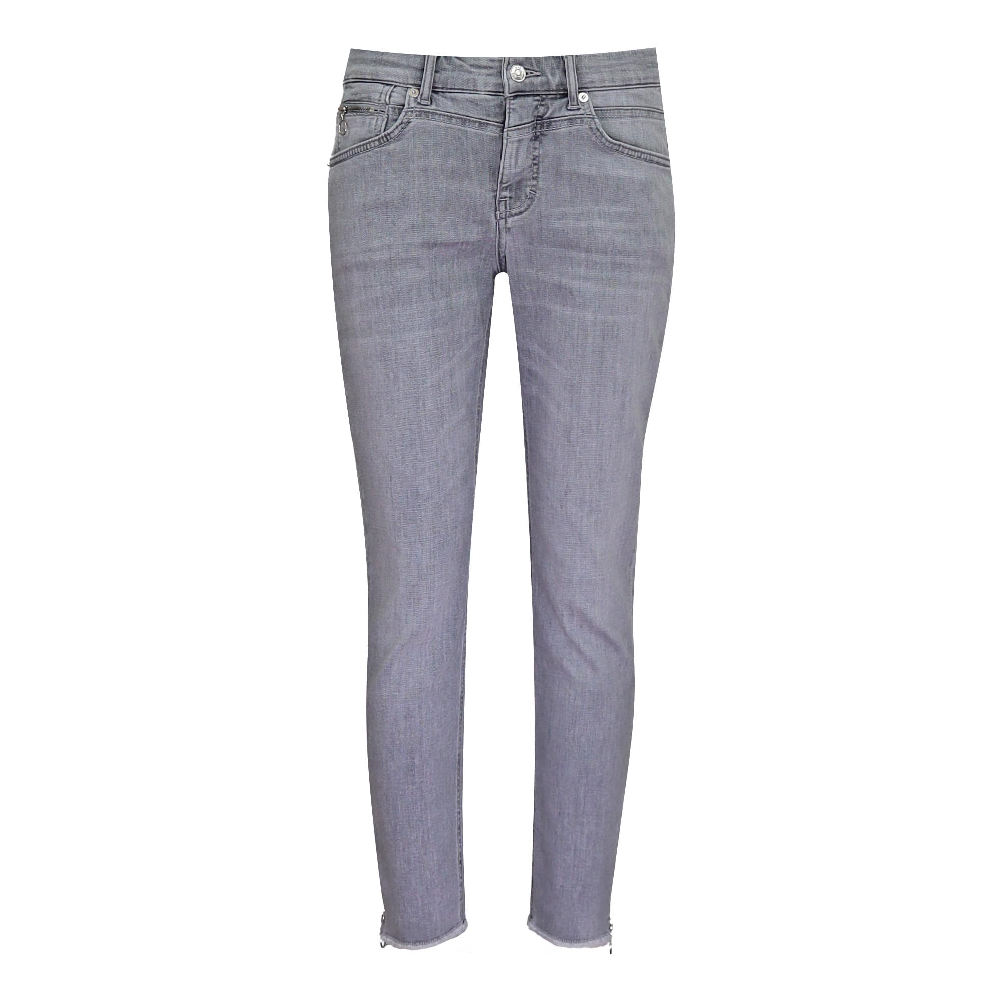 Lichtgrijze jeans van MAC, model Rich Slim chic, straight fit, slim leg. Deze 7/8 jeans heeft een slim fit pasvorm met twee steekzakken en twee achterzakken. De broek is gemaakt van lichtgrijze denim stretch stof en sluit met een knoop- en ritssluiting. De onderzijde van de broekspijpen zijn gerafeld en hebben een ritsje aan de zijkant.