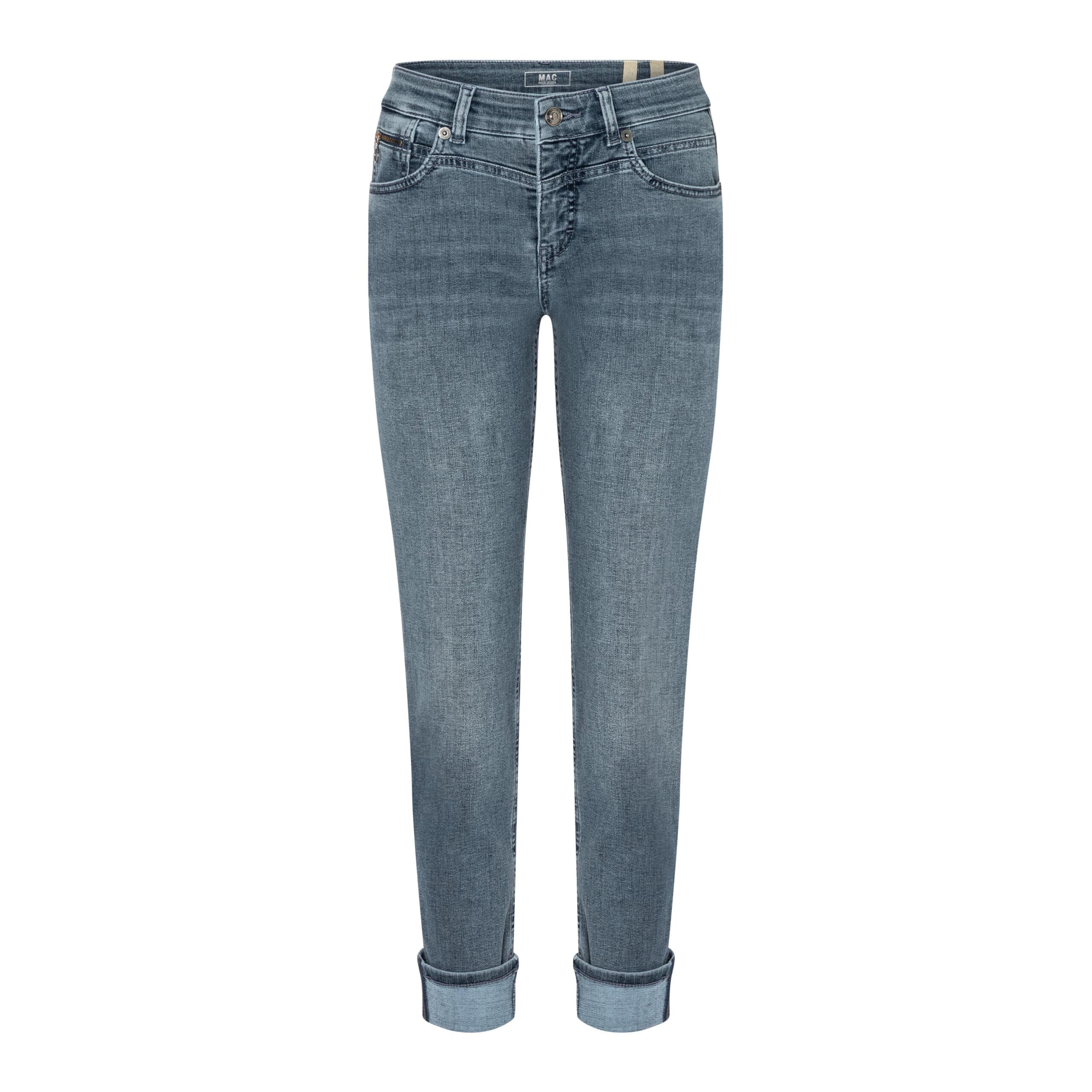 Blauwe jeans van MAC, model Rich Slim hem glam, straight fit, slim leg in greyish midblue. Deze denim broek sluit met een knoop- en ritssluiting, heeft een slim fit pasvorm met twee steekzakken aan de voorzijde en twee achterzakken. De spijkerbroek is gemaakt van een denim stretch stof en heeft aan de binnenzijde van de zoom een zilveren kettinkje wat zichtbaar is als je deze omslaat.
