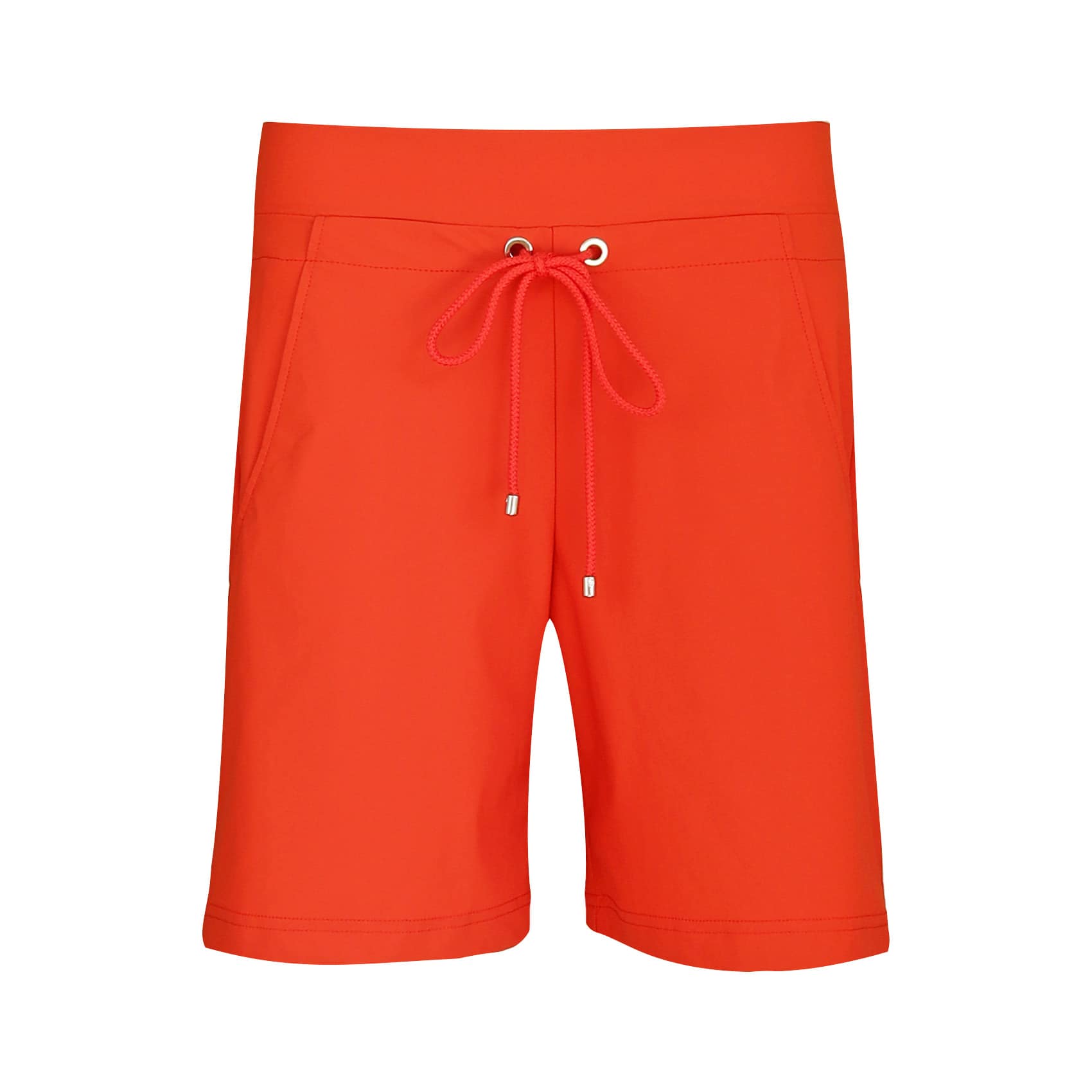 Relaxte bermuda van MAC, model Bermuda summer. Deze korte broek is gemaakt van een dunne soepel vallende stof in oranje rood. De shorts heeft een elastische taille en twee steekzakken.