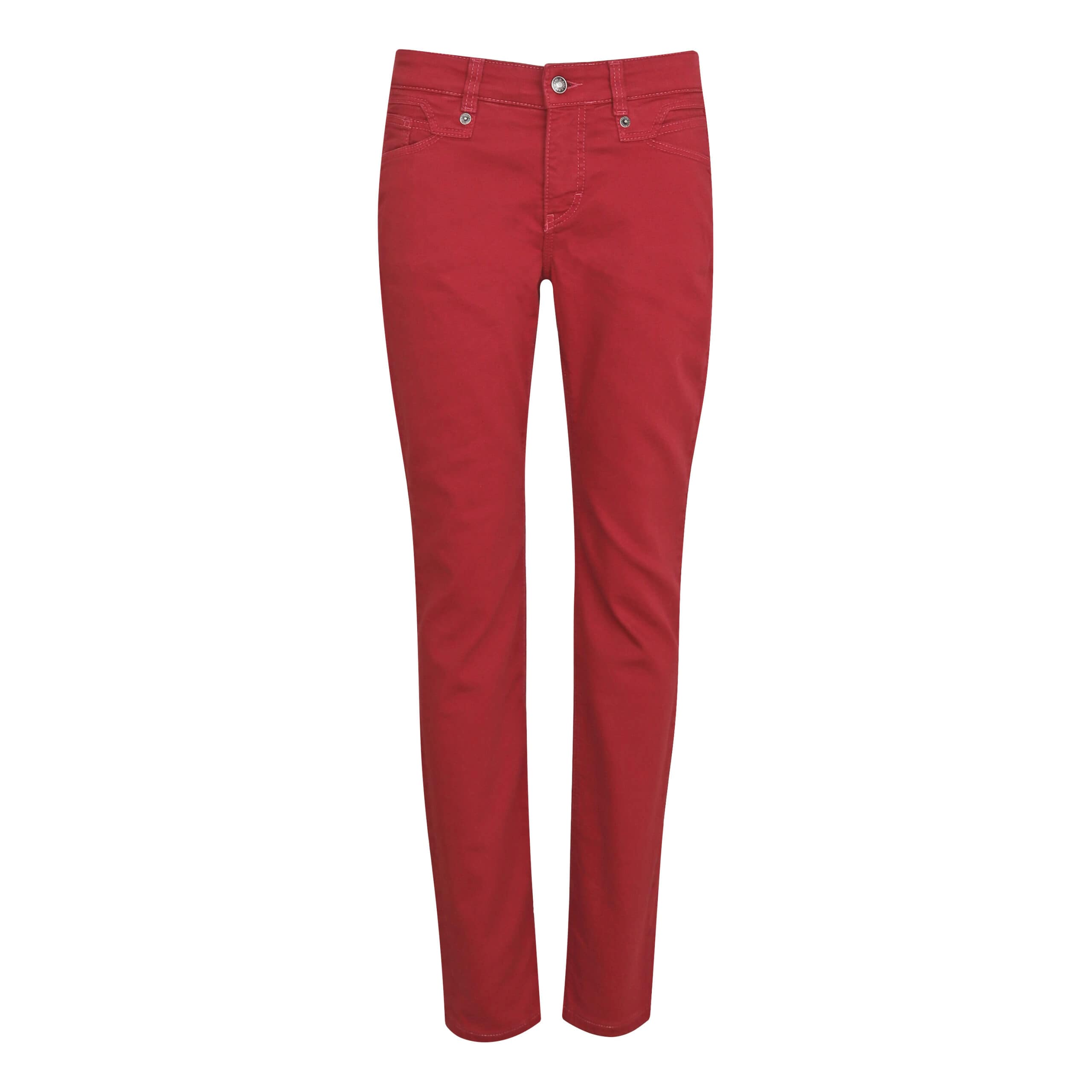 Rode jeans van MAC, model Rich Slim, straight fit, slim leg. Deze 7/8 denim broek heeft een slim fit pasvorm met twee steekzakken aan de voorzijde en twee achterzakken. De spijkerbroek is gemaakt van een rode denim stretch stof en sluit met een knoop- en ritssluiting.