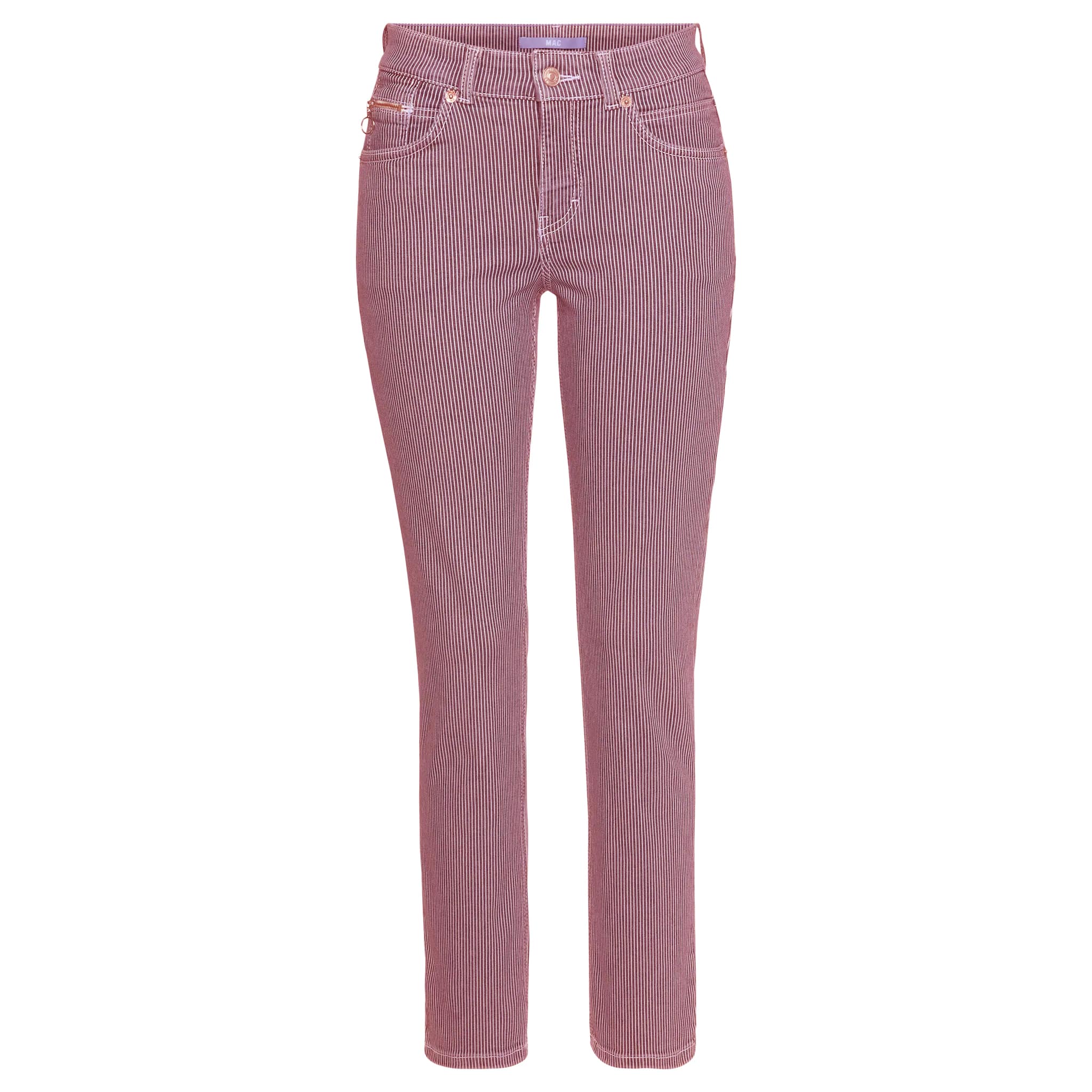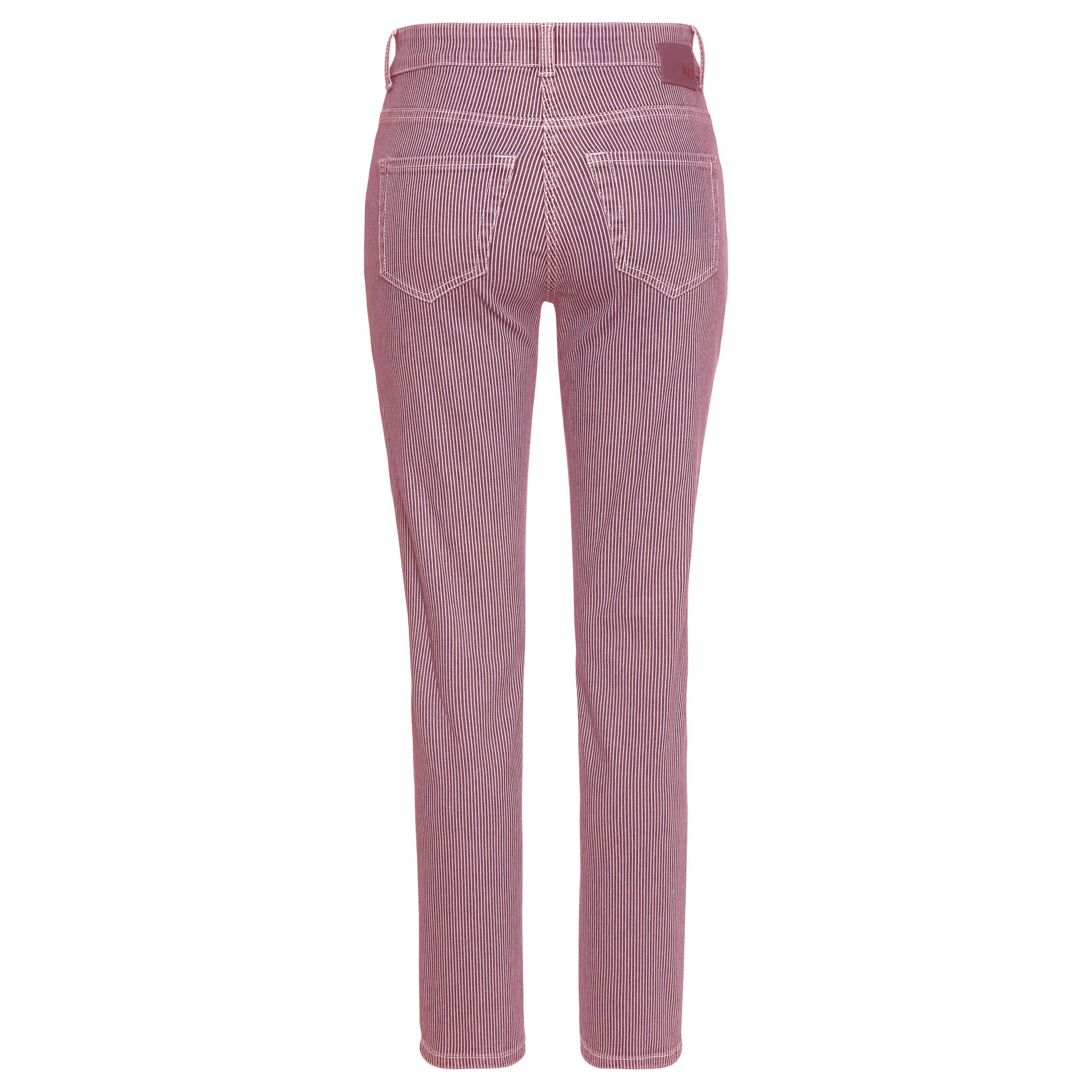 Rood gestreepte jeans van MAC, model Slim straight fit slim leg. Deze lange broek is gemaakt van stretch denim en heeft een normale taille met rechte broekspijpen. De slim fit jeans sluit met een knoop- en ritssluiting en heeft twee steekzakken en twee achterzakken.