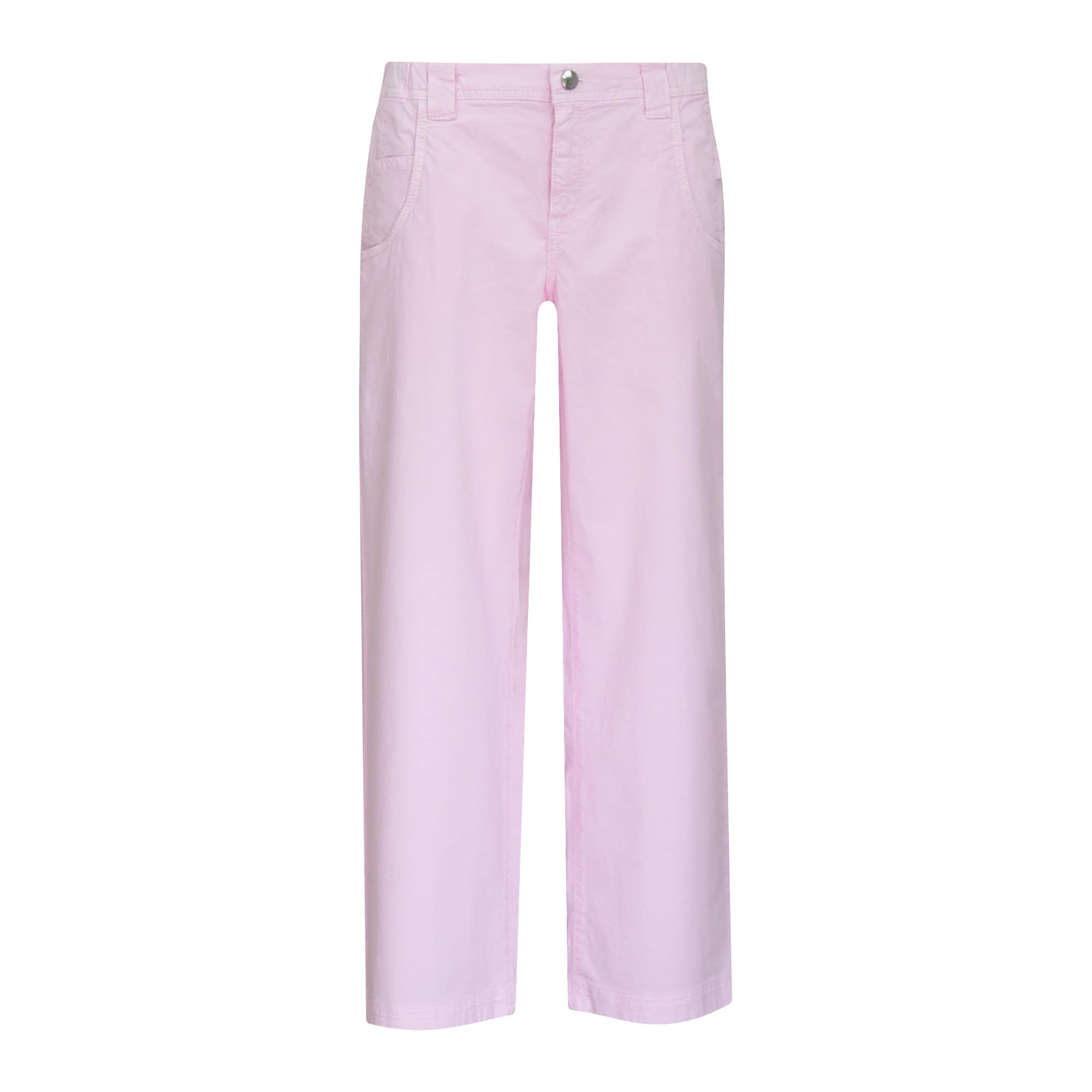 Wijde pantalon van MAC, model Noa. Deze roze broek is gemaakt van stretch katoen en heeft een normale taille, die aan de achterzijde elastische is, met wijde, rechte broekspijpen. De cropped broek sluit met een knoop- en ritssluiting en heeft twee steekzakken en twee achterzakken.