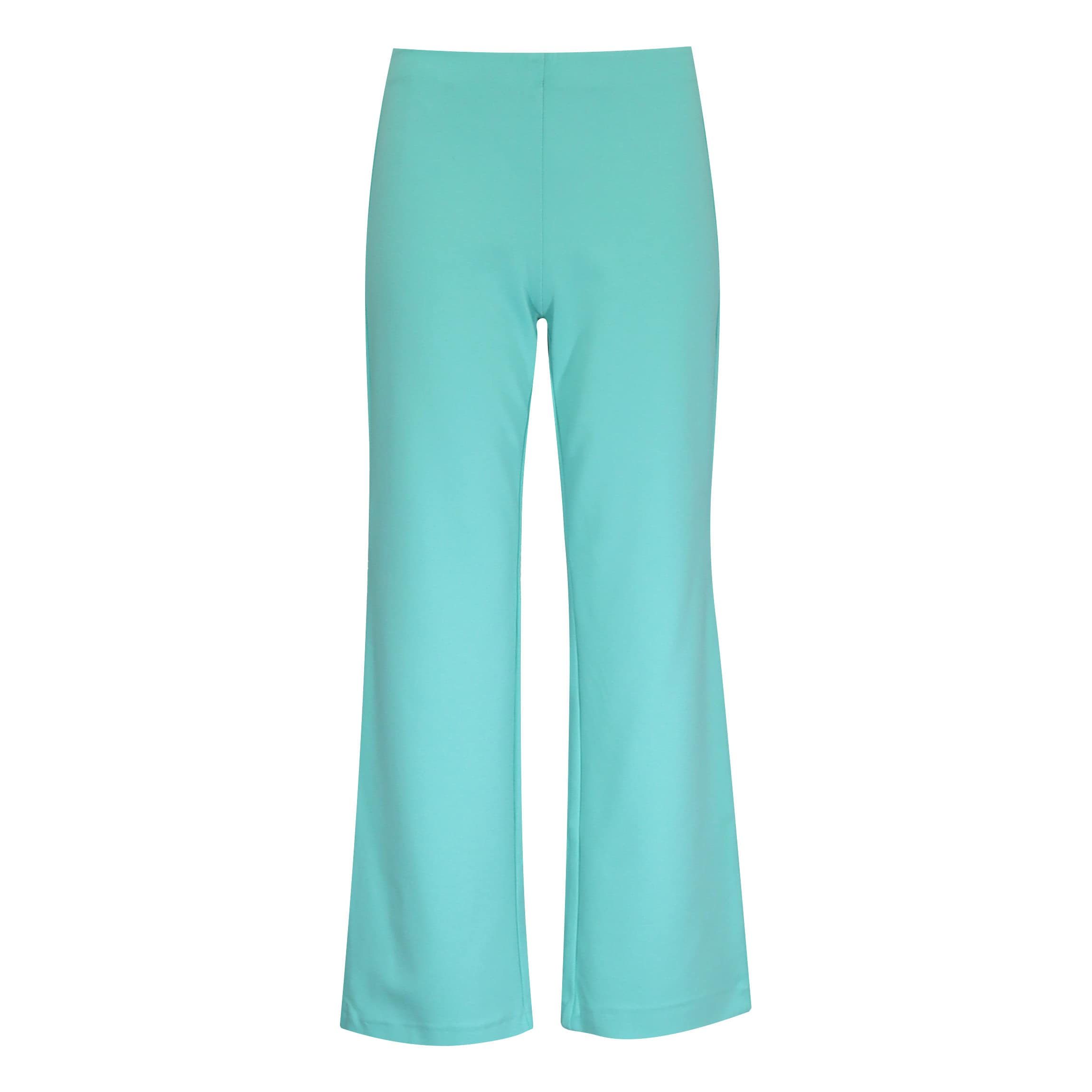 Turquoise pantalon van MAC, model Flare Kick. Deze jersey broek is gemaakt van stretch stof, heeft licht uitlopende broekspijpen en valt boven de enkels. De pantalon heeft een hoge taille en een elastische tailleband.