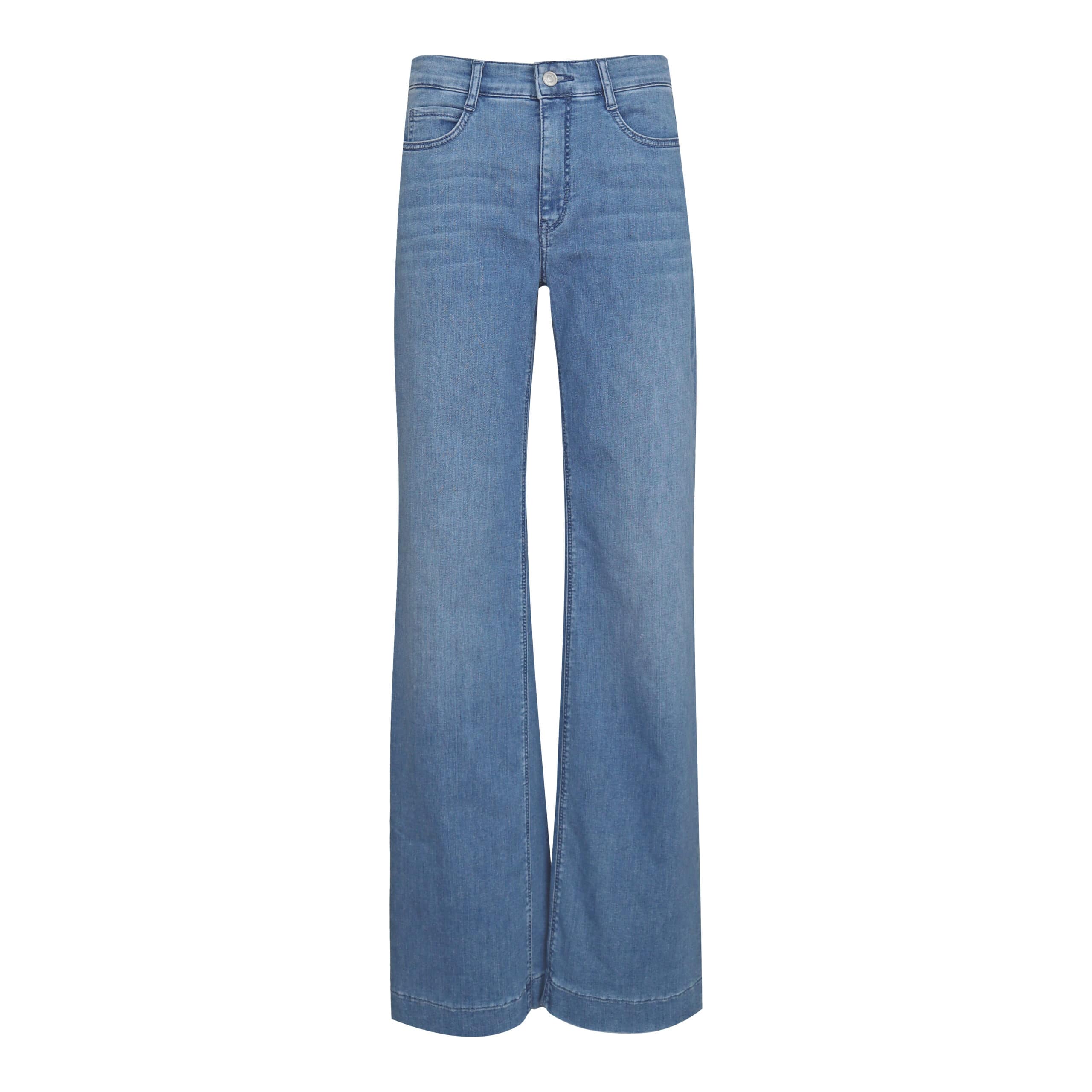 Blauwe jeans van MAC, model Wide, straight fit, wide leg in authentic baby blue. Deze broek is gemaakt van stretch denim, heeft een hoge taille en wijde, rechte broekspijpen. De jeans sluit met een knoop- en ritssluiting, heeft twee steekzakken en twee achterzakken.