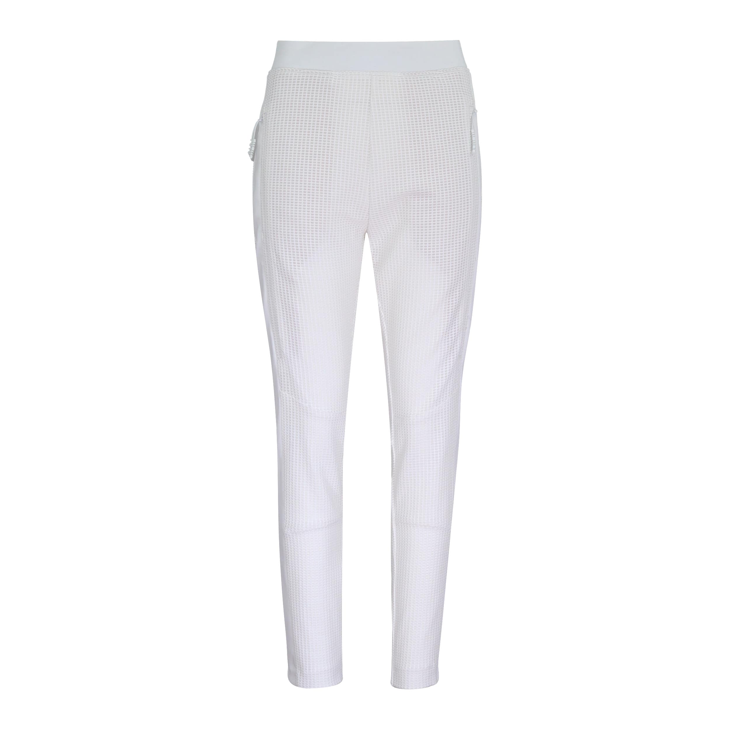 Witte relaxte pantalon van MAC, model Future 2.08 patch. Deze witte broek heeft taps toelopende broekspijpen met twee zakken achter ritsjes aan de voorzijde. De broek is gemaakt van een soepel vallende stretch stof met een mesh laag, heeft ritsjes aan de achterzijde van de broekspijpen en een elastische tailleband.