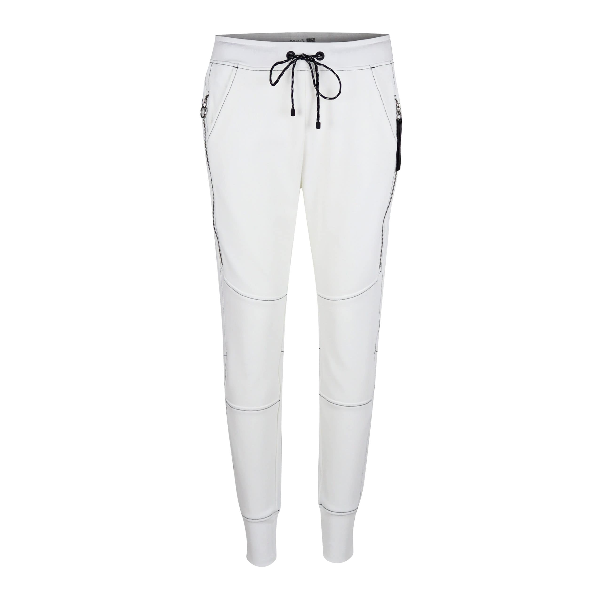 Relaxte pantalon van MAC Jeans, model Future Space. Deze witte 7/8 broek heeft taps toelopende broekspijpen met twee zakken achter ritsjes aan de voorzijde. De broek is gemaakt van een soepel vallende stof en heeft een tailleband met trekkoord. Aan de achterzijde op de kuit staat MAC geborduurd.